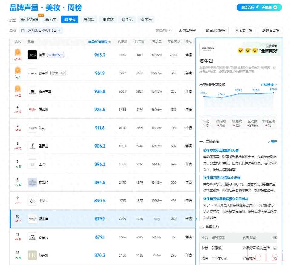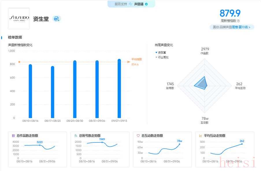 新榜品牌聲量?美妝周榜(09 月 07 - 09 月 13 日)發(fā)布,資生堂以 879.9 的聲量新榜指數(shù)位居第十 。環(huán)比上周,作品數(shù)增加 756,互動(dòng)量提升 29.9w ,憑借一系列有力的品牌動(dòng)作,在競爭激烈的美妝市場中持續(xù)提升影響力。
