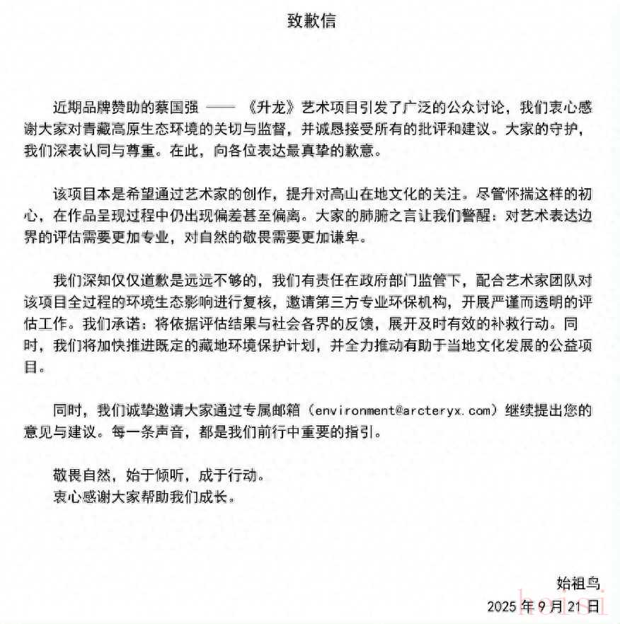 9月21日,始祖鳥在國內社交平臺發(fā)布的致歉信中指出,“近期品牌贊助的蔡國強《升龍》藝術項目引發(fā)了廣泛的公眾討論,該項目本是希望通過藝術家的創(chuàng)作,提升對高山在地文化的關注。盡管懷揣這樣的初心,在作品呈現過程中仍出現偏差甚至偏離。大家的肺腑之言讓我們警醒:對藝術表達邊界的評估需要更加專業(yè),對自然的敬畏需要更加謙卑?!?/p>