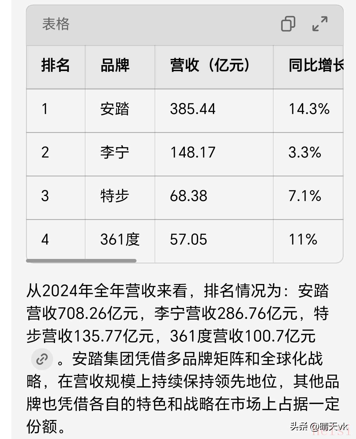 那么按照去年的營收,安踏以385.44億穩(wěn)居中國運動服裝品牌第一名,而且增速也是第一名!
