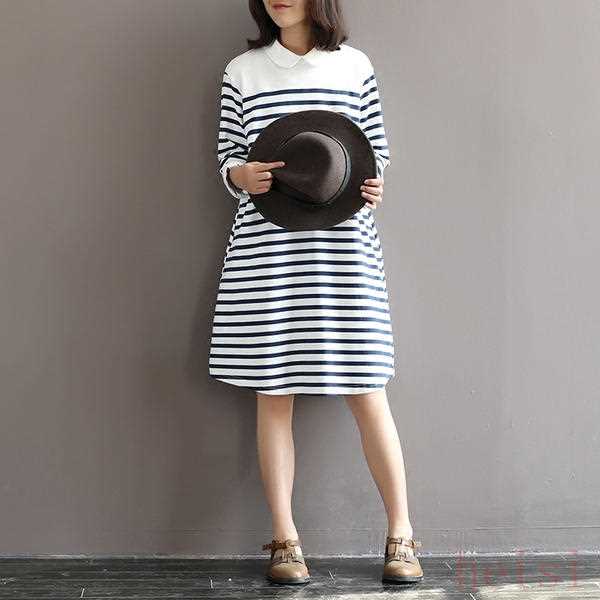 寬松娃娃領A字裙。全棉的面料,手感柔軟舒適。藏青條紋和白色的拼接,看起來很清爽,細條紋穿起來顯瘦哦。彼得潘領的設計,很減齡的元素,也能讓臉型看起來更柔和。寬松套頭款式,頸后做了晶瑩的半扣,也方便實用呢~