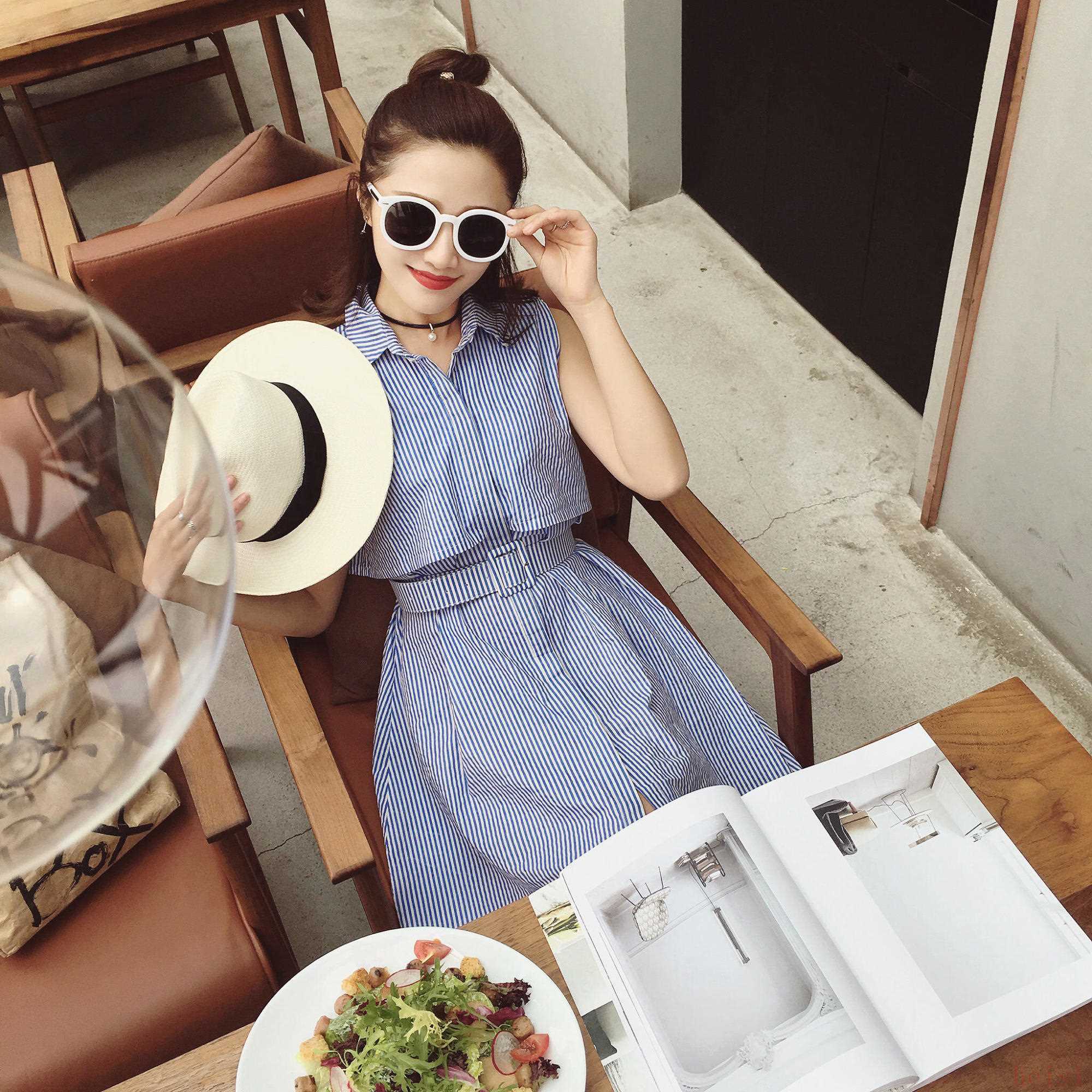 無袖小翻領連衣裙。時尚的海軍風撞色條紋設計,清新甜美,反復打版修改,只為打造更合體修身的版型,上衣假兩件設計,搭配腰帶收腰,穿著沒有束縛感,配色清新淡雅,韓風十足,彰顯青春氣息,減齡款。
