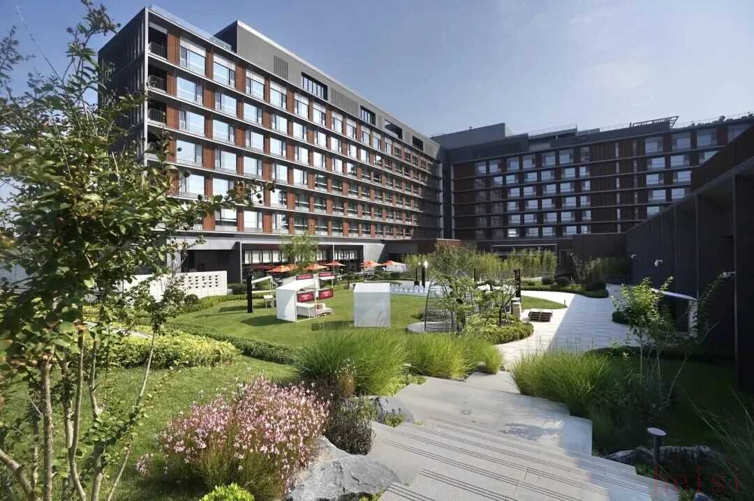 酒店建筑以幾何形態(tài)玻璃幕墻捕捉城市光影,內部集時尚客房、特色餐廳、屋頂酒吧、健身中心、千平米會議場地及戶外花園于一體,可休閑漫步、舉辦草坪婚禮。