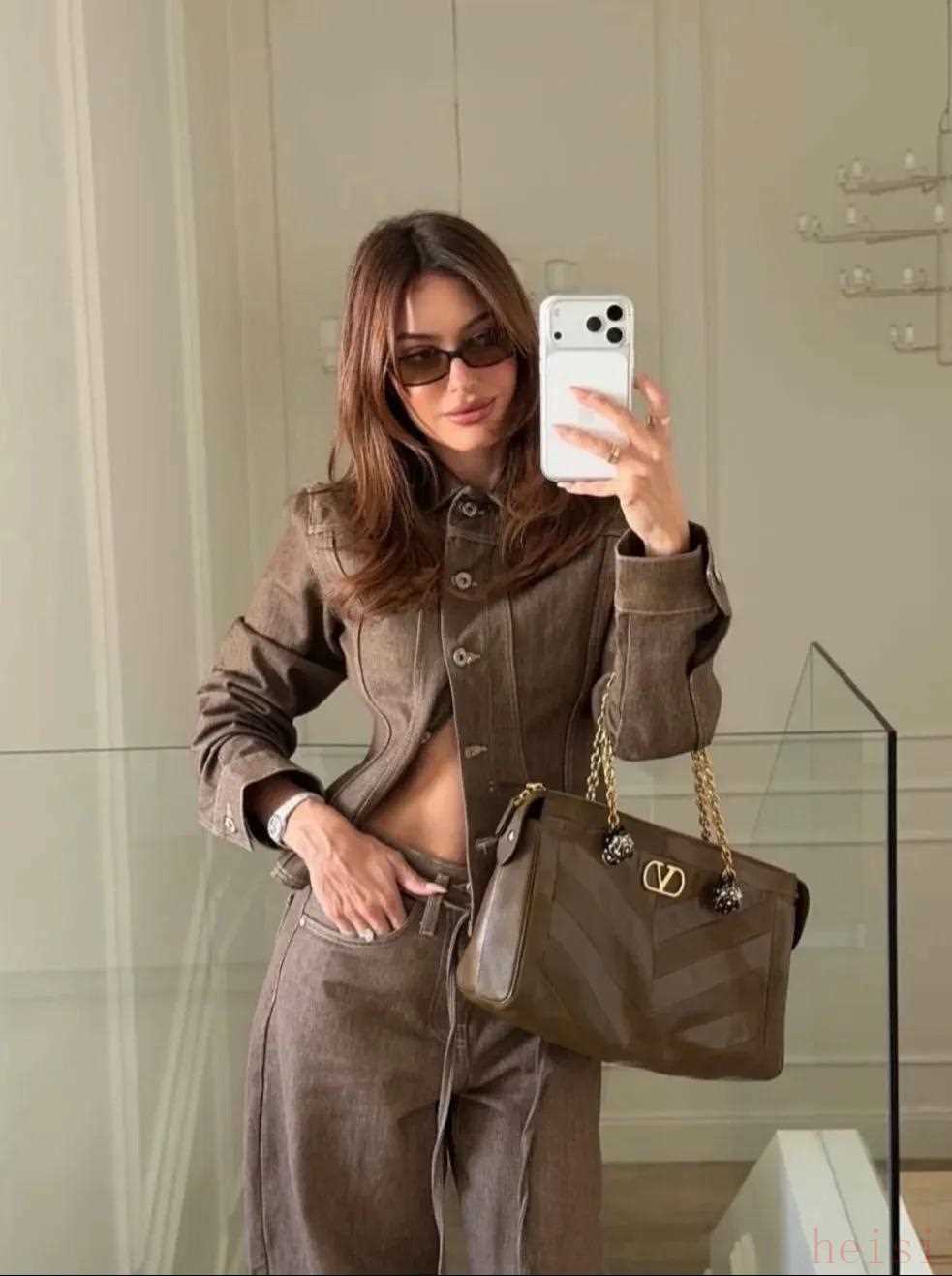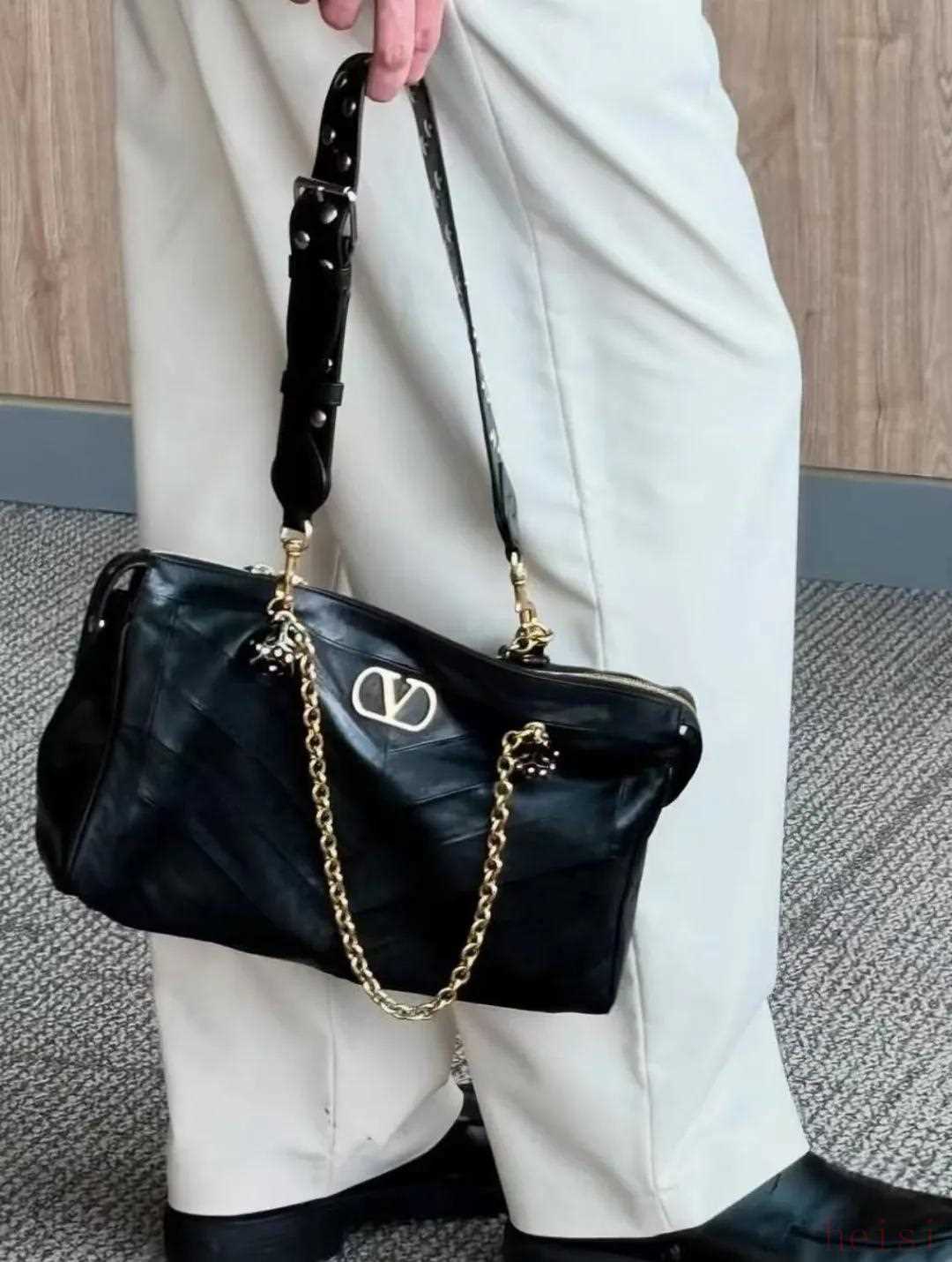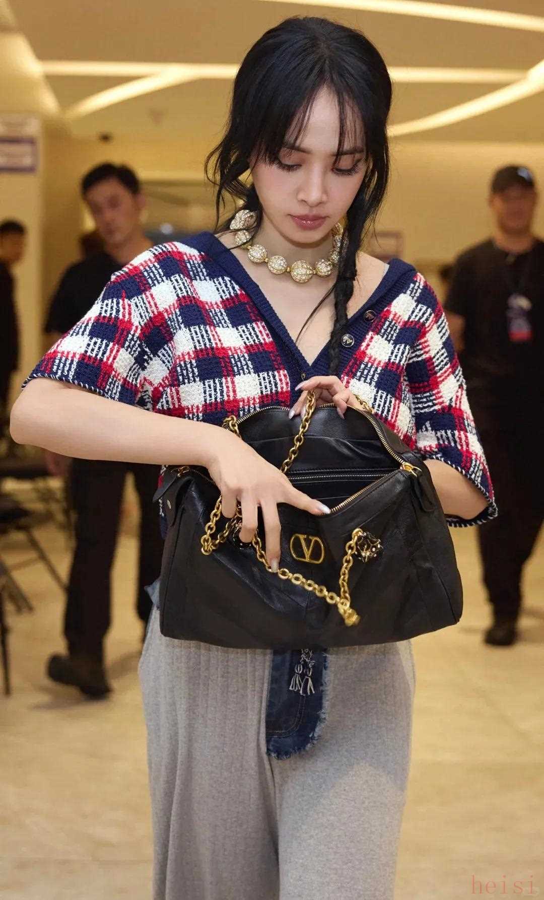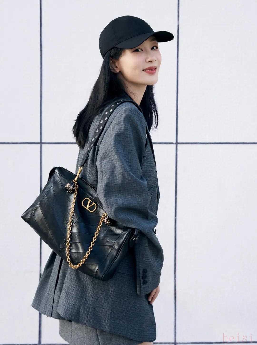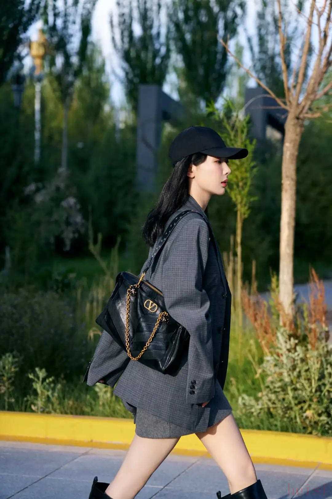 楊紫就用它搭了一身松弛職場風(fēng),和灰色西裝形成深淺層次,復(fù)古質(zhì)感的VLogo在光影下閃耀,堪稱點(diǎn)睛之筆。