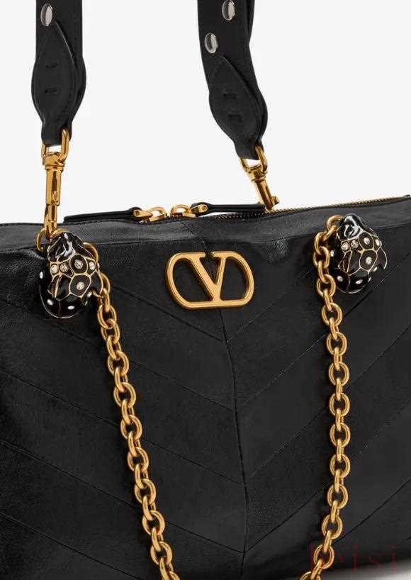 Valentino Panthea的VLogo,在系列中尤為特別。極具雕塑感的三維立體結(jié)構(gòu)位于包包頂端,橢圓形外框托住V字底部,且上不封口。