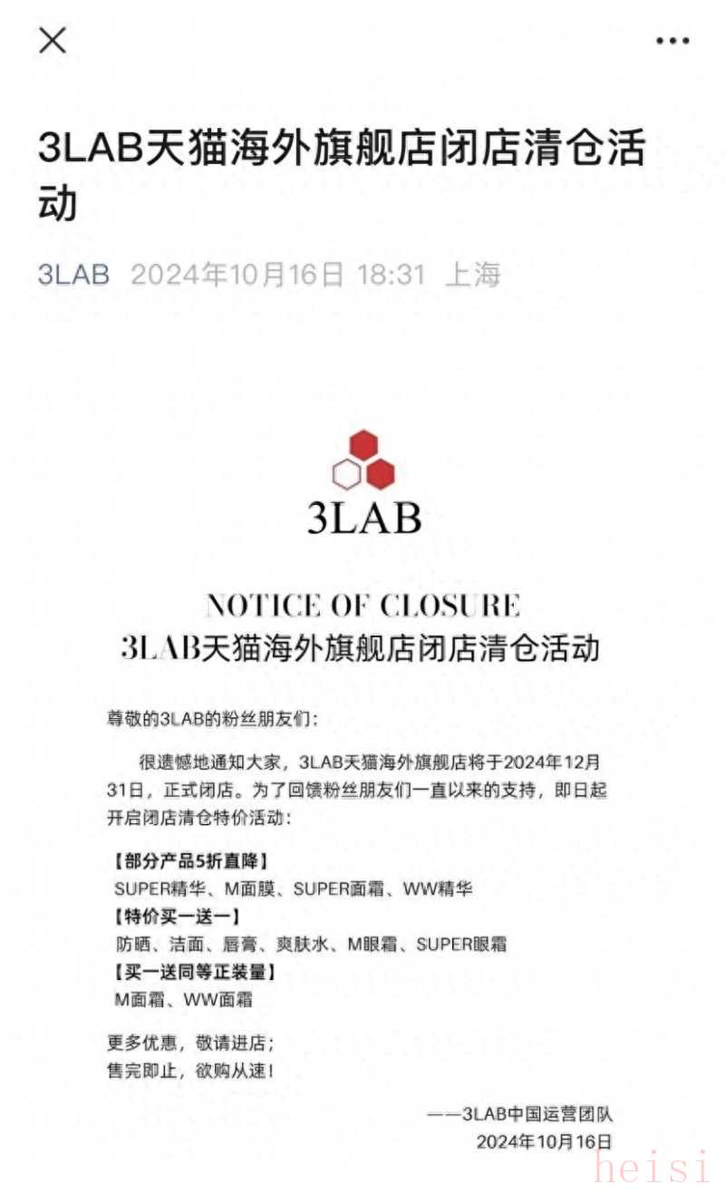 10月16日,美國高科技御齡護(hù)膚品牌3LAB在小紅書、官微等多個(gè)賬號(hào)發(fā)文《3LAB天貓海外旗艦店閉店清倉活動(dòng)》,宣布3LAB天貓海外旗艦店將于2024年12月31日正式閉店,并開啟閉店清倉活動(dòng)。