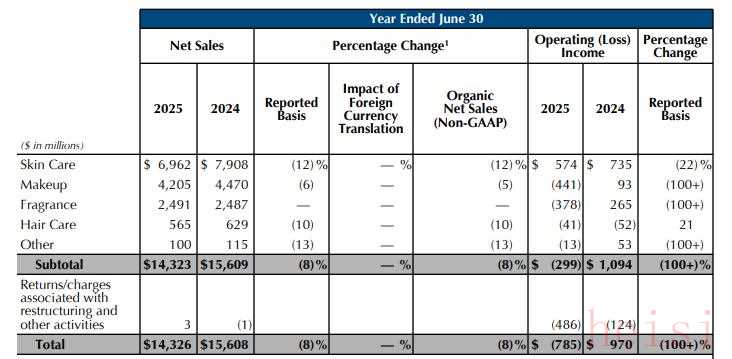 按品類劃分,2025財(cái)年,除香水品類凈銷售額同比基本持平且微增外,雅詩(shī)蘭黛旗下其余品類營(yíng)收均出現(xiàn)不同程度的下滑。