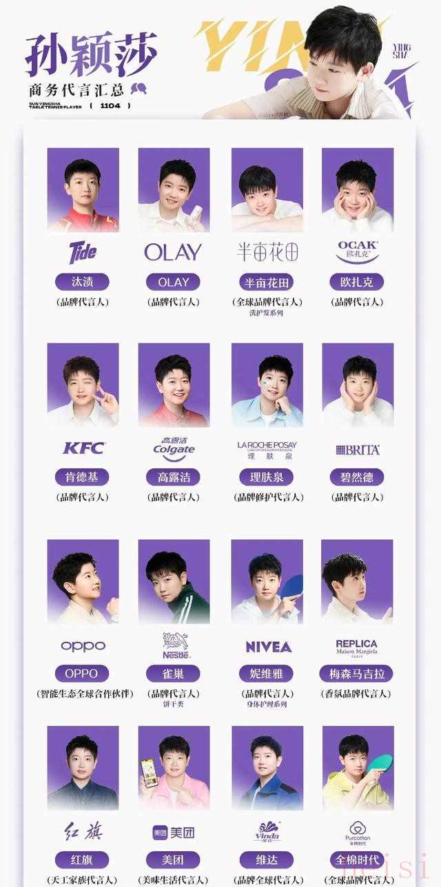 孫穎莎的商業(yè)代言也不少。全棉時代是她的第16個代言了。有人在網(wǎng)上發(fā)了孫穎莎代言的圖,正好湊成了16宮格,看著挺壯觀的。