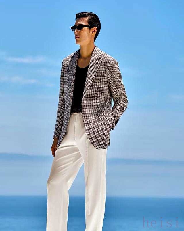 胸袋塞亞麻方巾,折兩下,顏色跟褲子順,不搶臉。