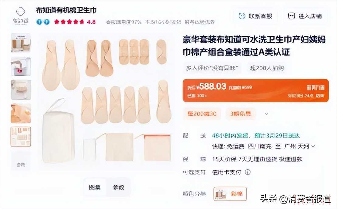 不過,并非所有水洗衛(wèi)生巾的價格都便宜。記者在某電商平臺上就發(fā)現(xiàn)一款14片裝的豪華套裝組合產(chǎn)品,優(yōu)惠前的售價為699元,折后也要588元。
