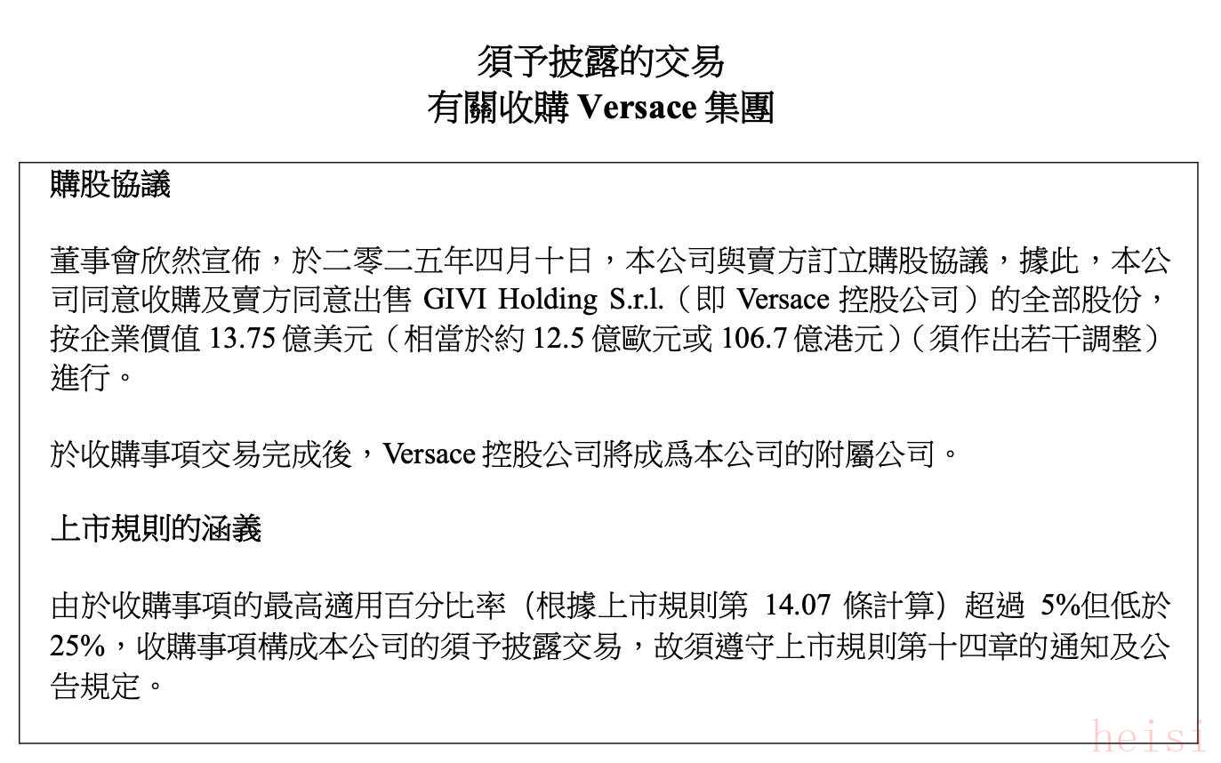如今靴子終于落地。4月10日晚,普拉達(dá)在港交所發(fā)布公告稱,計(jì)劃以13.75億美元(約合12.5億歐元)的價(jià)格收購(gòu)意大利時(shí)尚品牌范思哲。收購(gòu)?fù)瓿珊?,范思哲控股公司將成為普拉達(dá)的附屬公司。公告稱,范思哲鮮明的美學(xué)風(fēng)格將為普拉達(dá)集團(tuán)的品牌組合帶來高度的互補(bǔ)效應(yīng),并承諾未來范思哲將保持其品牌創(chuàng)意與文化底蘊(yùn),全面享受集團(tuán)綜合平臺(tái)的優(yōu)勢(shì)。