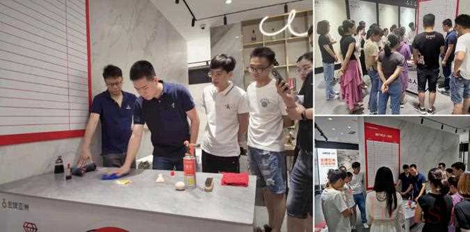 金牌企業(yè)副總裁:湯浩(左一)在金牌亞洲終端門店,我們經(jīng)常能看到這樣的畫面:消費者圍在一起,認真地觀看店員做實驗。店員輪流拿起筆、食用油、醬油、咖啡、可樂、陳醋等,在金絲絨瓷磚上又涂又畫,再拿起電鉆、尖刀、鋼絲球、噴火槍等,對金絲絨瓷磚施加各種“酷刑”。當大家以為這塊瓷磚將變得面目全非的時候,店員拿起抹布輕輕一擦,金絲絨瓷磚竟然完好如初,沒能留下任何污漬痕跡。而這就是金絲絨瓷磚能夠成為市場新寵的主要原因——超抗污!