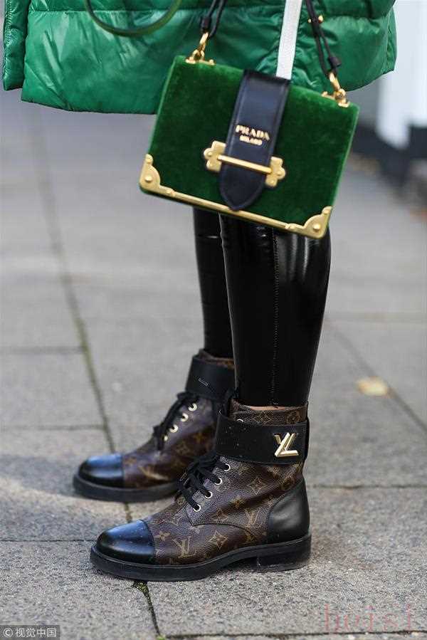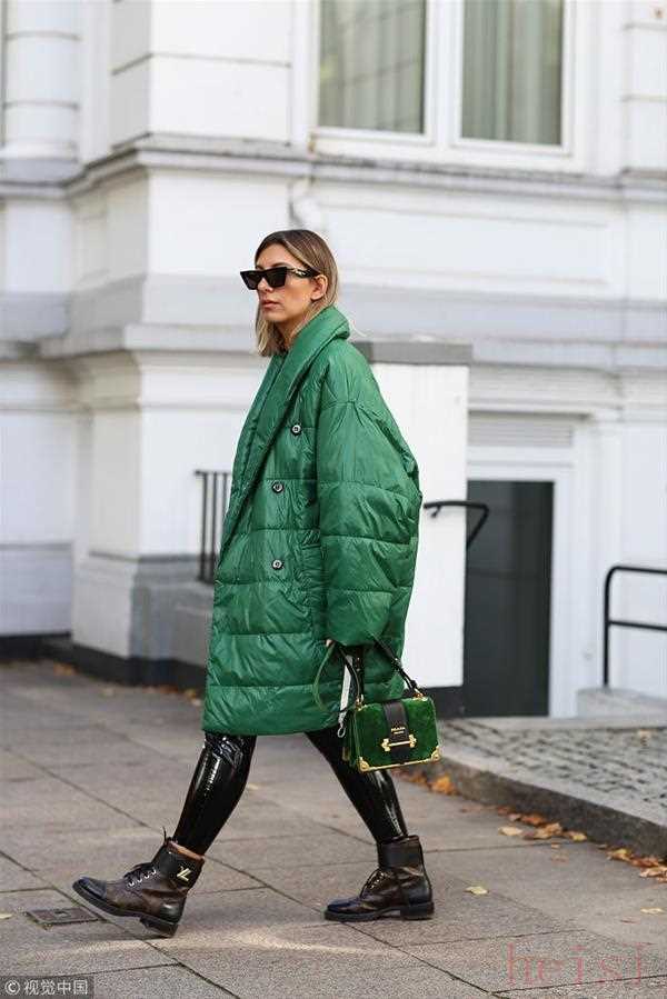 時尚博主 Aylin Koenig街拍。品牌:Baum & Pferdgarten羽絨服,Prada手袋,topshop皮褲, Louis Vuitton 平底靴,配飾:Prada手袋,金絲絨綠色手拎包