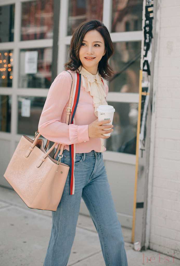 陶紅粉色“拉夫領(lǐng)上衣+牛仔褲”造型街拍,輕熟范兒十足。 圖片來(lái)源/視覺(jué)中國(guó)