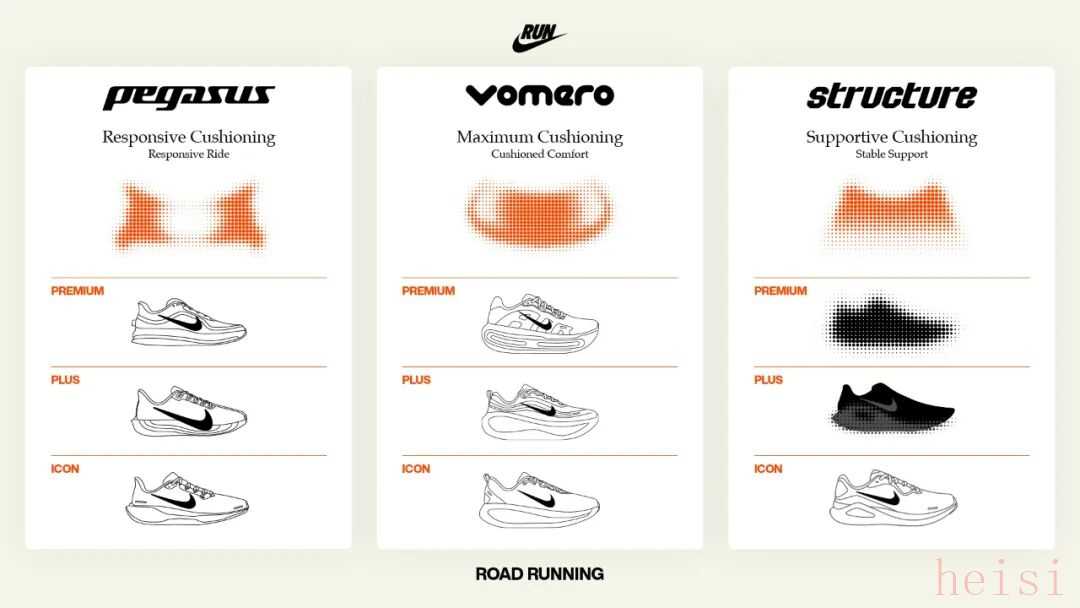 基于對(duì)跑者需求的精準(zhǔn)把握,耐克今年對(duì)路跑鞋矩陣進(jìn)行了戰(zhàn)略性的“9-box”重組,圍繞緩震性能構(gòu)建起清晰的全場(chǎng)景產(chǎn)品體系:Vomero系列主打超強(qiáng)緩震,Structure系列專注支撐穩(wěn)定,Pegasus系列則強(qiáng)調(diào)回彈響應(yīng),全面覆蓋從入門跑者到精英選手的多元化需求。