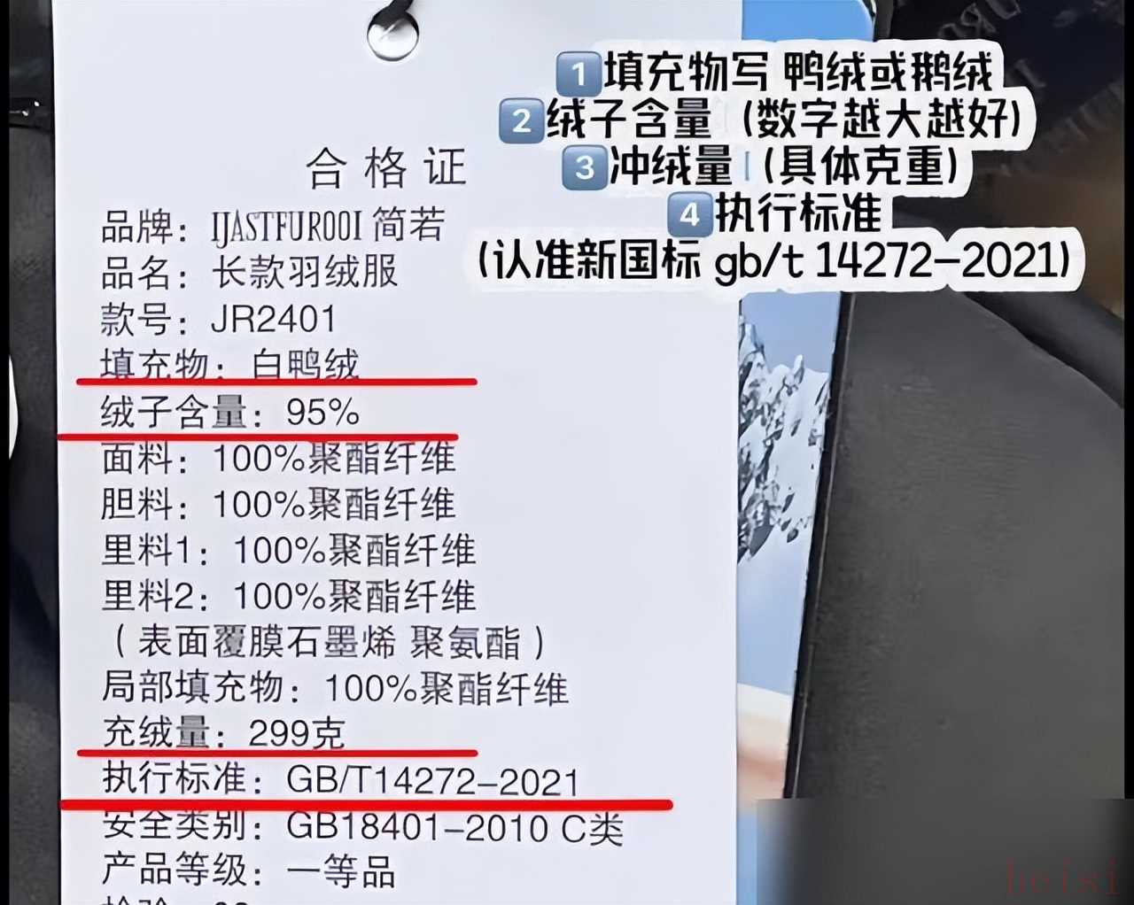 先給你們敲個重點:買羽絨服別瞎買,先看三個“硬指標”!第一看執(zhí)行標準,必須是GB/T 14272-2021(新國標),要是吊牌上寫的是2011版,直接pass,要么是庫存貨要么是假貨;第二看絨子含量,現(xiàn)在新國標早把“含絨量”改成“絨子含量”了,必須≥50%才叫羽絨服,寫“含絨量”的別買,坑你沒商量;第三看充絨量,短款100-150克、中長150-200克、長款/極寒地區(qū)200克以上,別聽商家吹“90%絨子含量就夠”,充絨量不夠,再高的絨子也不保暖!