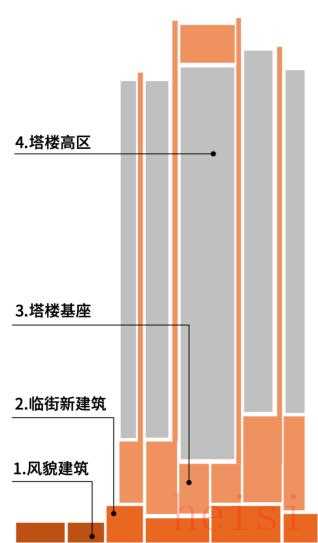 臨街建筑沿襲了歷史風貌建筑的新古典風格,塔樓基座則大量應用了上海弄堂常見的石庫門、拱窗元素,而塔樓高區(qū)則以通透輕盈的玻璃幕墻現(xiàn)代風格為主。