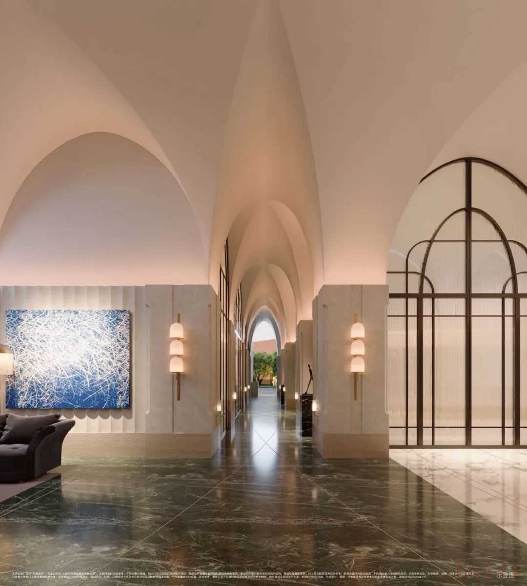 從下到上立面風格的變化,仿佛在講述上海這座城市的過去、現(xiàn)在與未來,既傳承了典雅的海派腔調(diào),又展現(xiàn)出了蓬勃的現(xiàn)代活力和生長性,充滿巧思!又比如在公區(qū)設計上,大量應用了拱門與格窗元素,處處傳遞著海派雅奢的氣息。