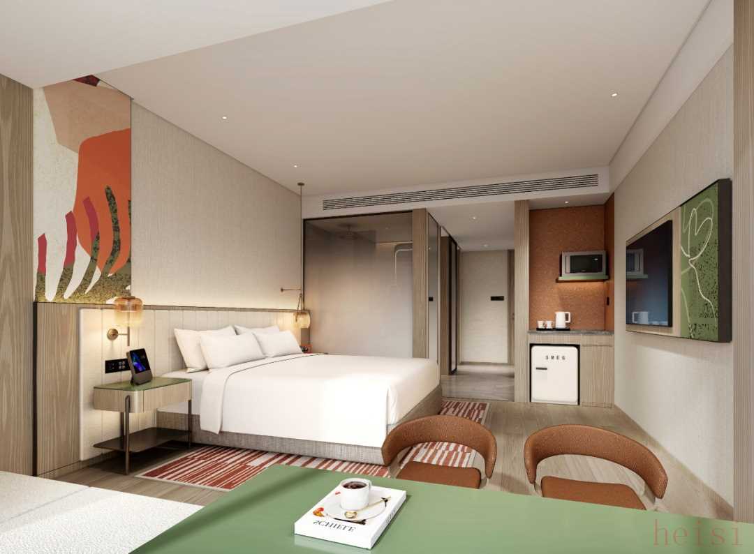 在酒店樣板間內(nèi),記者注意到,客房整體空間色彩以陶土棕為視覺基調(diào),營造濃厚居家氛圍;用青苔綠與甜菜紅的色彩搭配,增添空間活力感。房間內(nèi)均配置了語音控制系統(tǒng),游客通過語音即可完成對窗簾、電視、燈光的控制。