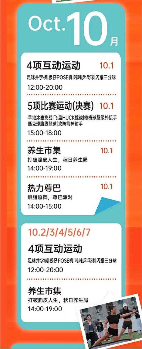 十一期間,還有“5項(xiàng)比賽運(yùn)動(dòng)(決賽)”“養(yǎng)生市集”“尊巴體驗(yàn)”等系列線下體驗(yàn)活動(dòng)豐富消費(fèi)者的假期生活。