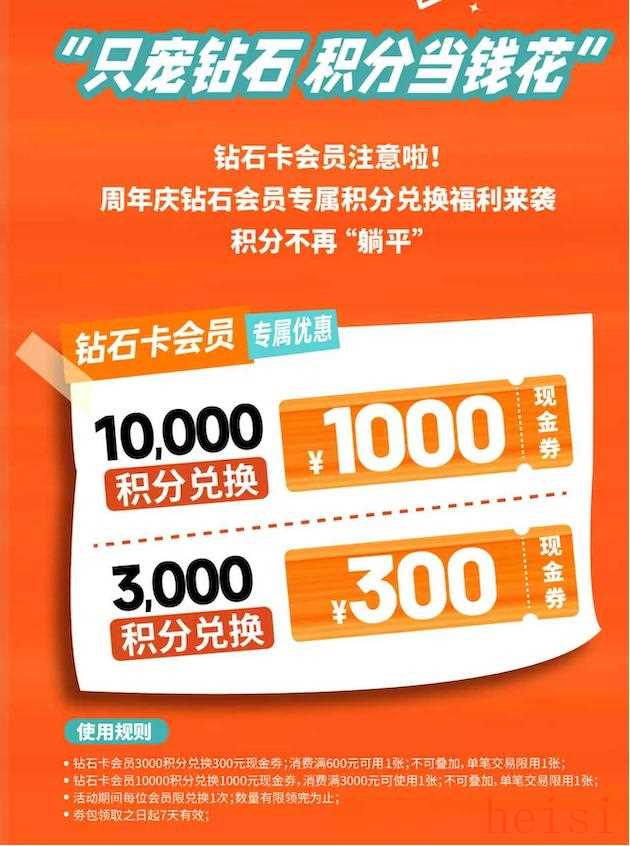 不用糾結(jié)積分怎么用,3000積分就能換300元現(xiàn)金券,日常購物滿600元可再使用一張;10000積分換1000元現(xiàn)金券也很合適,滿3000元即可使用一張。每個(gè)會(huì)員僅能兌換一次,現(xiàn)金券自領(lǐng)取后7天內(nèi)有效。