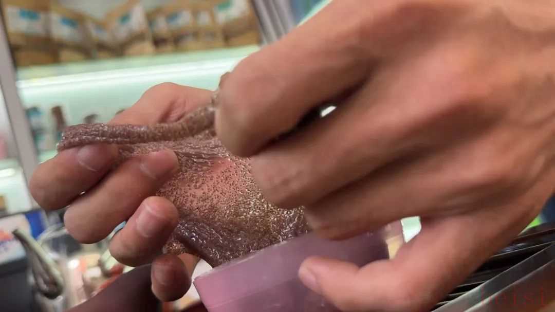 王舟隨即將兩盒海藻面膜樣品拆開,挖出三勺放入碗中兌水,幾分鐘后碗內(nèi)液體成膜,上面布滿棕黑色的“海藻籽”?!拔覀冑u的這一款是緬甸進口的。有一種國產(chǎn)的海藻沒有膠性,成本低很多。”