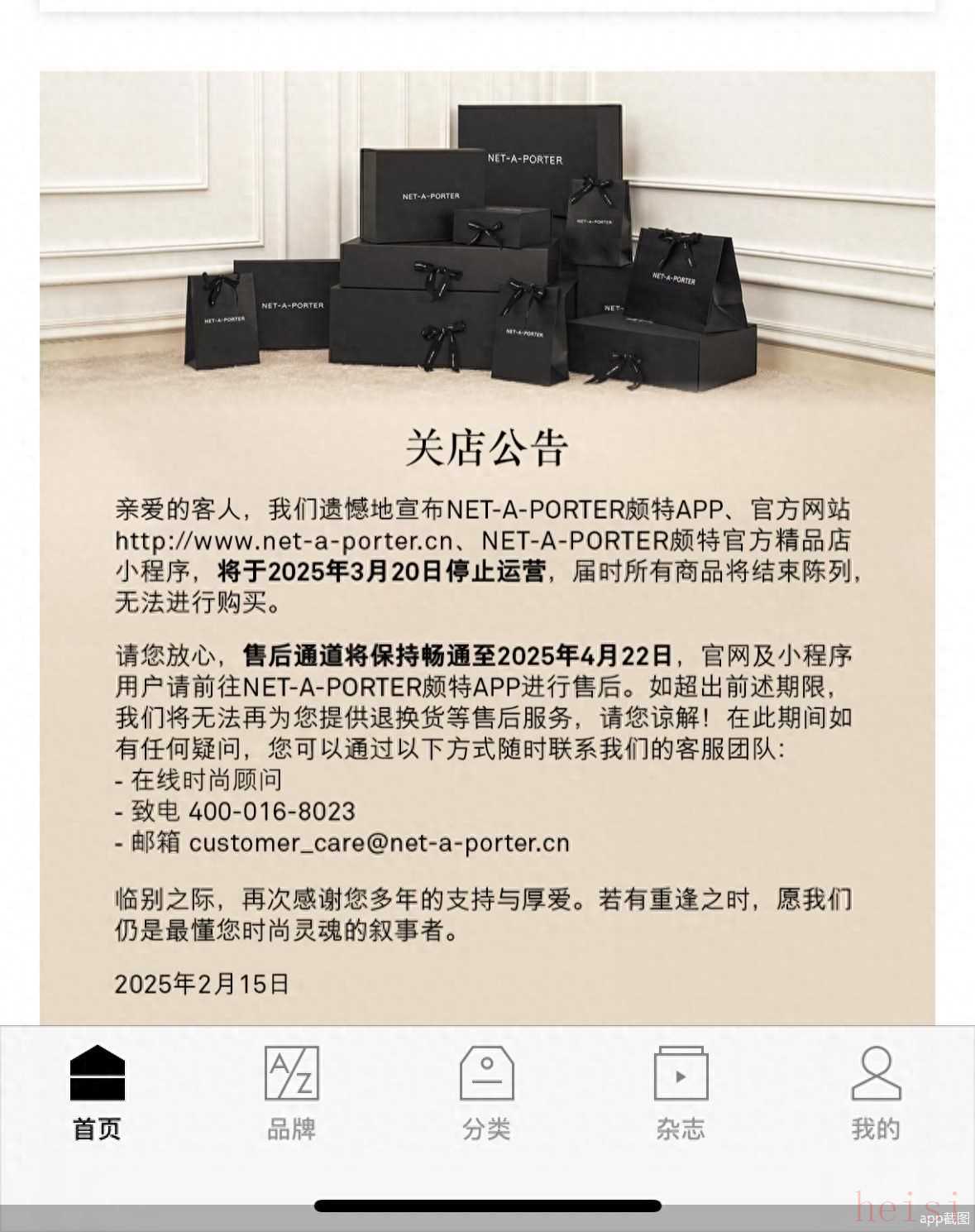 奢侈品電商的日子舉步維艱。Net-a-Porter App公告顯示,該公司將于3月20日關(guān)閉天貓、微信小程序、小紅書和抖音旗艦店,以及公司網(wǎng)站和App,并于4月22日終止售后服務(wù)。早在去年6月,Net-a-Porter母公司風(fēng)茂貿(mào)易(上海)有限公司首席執(zhí)行官吳雅婷就曾向員工宣布公司即將解散,還有多名設(shè)計(jì)師品牌主理人向北京商報(bào)記者表示,“2025春夏系列之后就不再與Net-a-Porter合作了”。目前,Net-a-Porter App中正在進(jìn)行0.5折起的優(yōu)惠活動(dòng)。Net-a-Porter 官方客服稱,“我們將始終保持期待,希望未來能以更好的方式與您相遇”。
