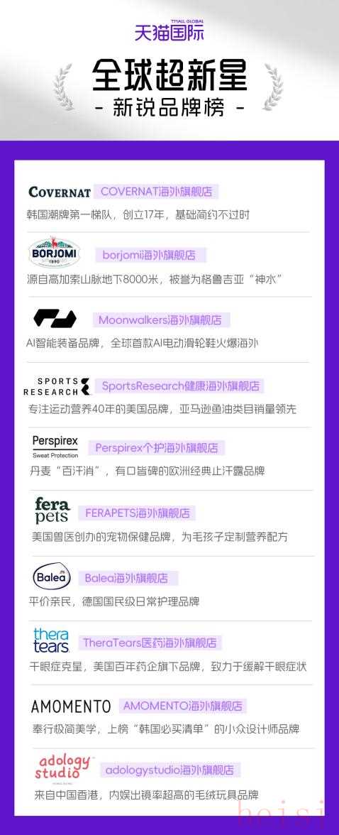 聚焦細(xì)分、個(gè)性化消費(fèi)需求的海外品牌在天貓站穩(wěn)腳跟,帶動(dòng)更多新品牌來中國市場拓展生意。10月10日,天貓國際的發(fā)布2025三季度全球超新星品牌榜顯示,韓國本土第一代街頭潮牌COVERNAT、在高加索山脈地下8000米取水的格魯吉亞國寶級礦泉水品牌BORJOMI、全球首款A(yù)I輪式外骨骼設(shè)備品牌Moonwalkers都來天貓開首店。據(jù)了解,這份榜單基于旗艦店生意規(guī)模、品牌影響力、消費(fèi)者喜愛度三個(gè)維度,每季度選出成長迅速的進(jìn)口新銳“尖子生”。