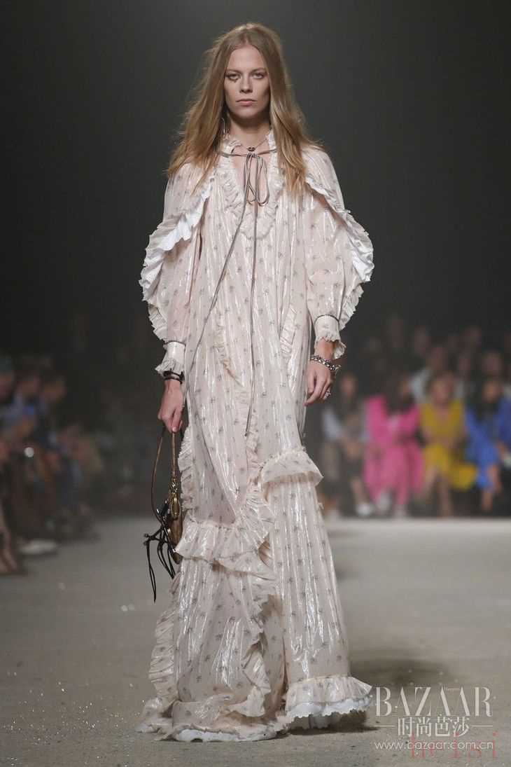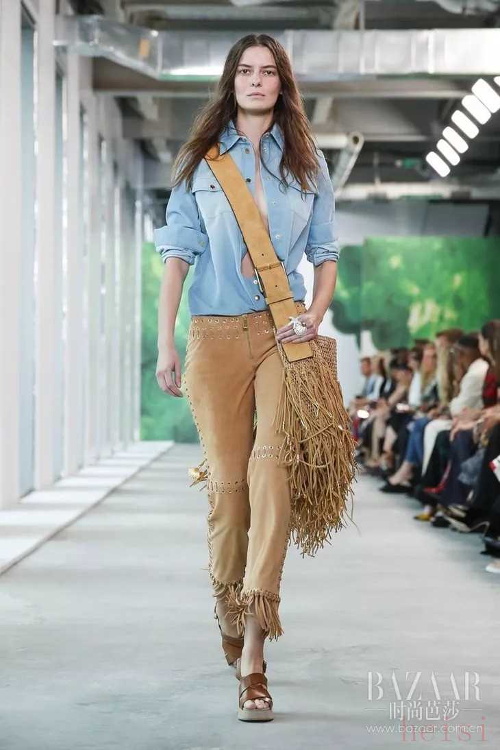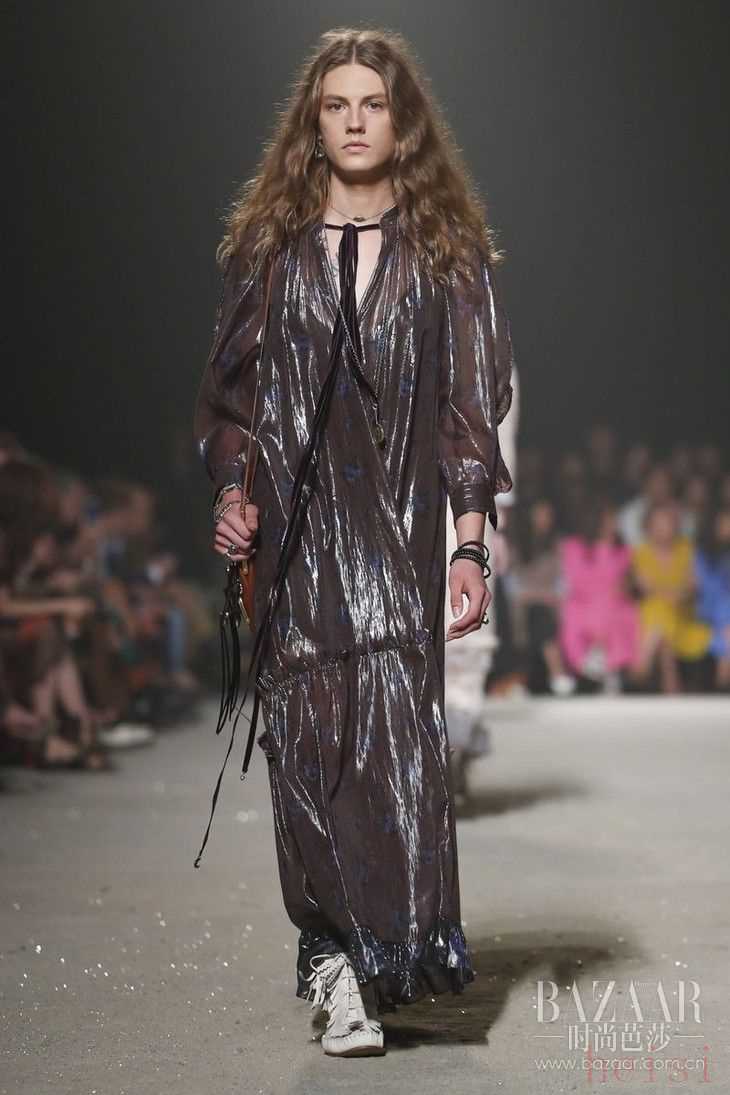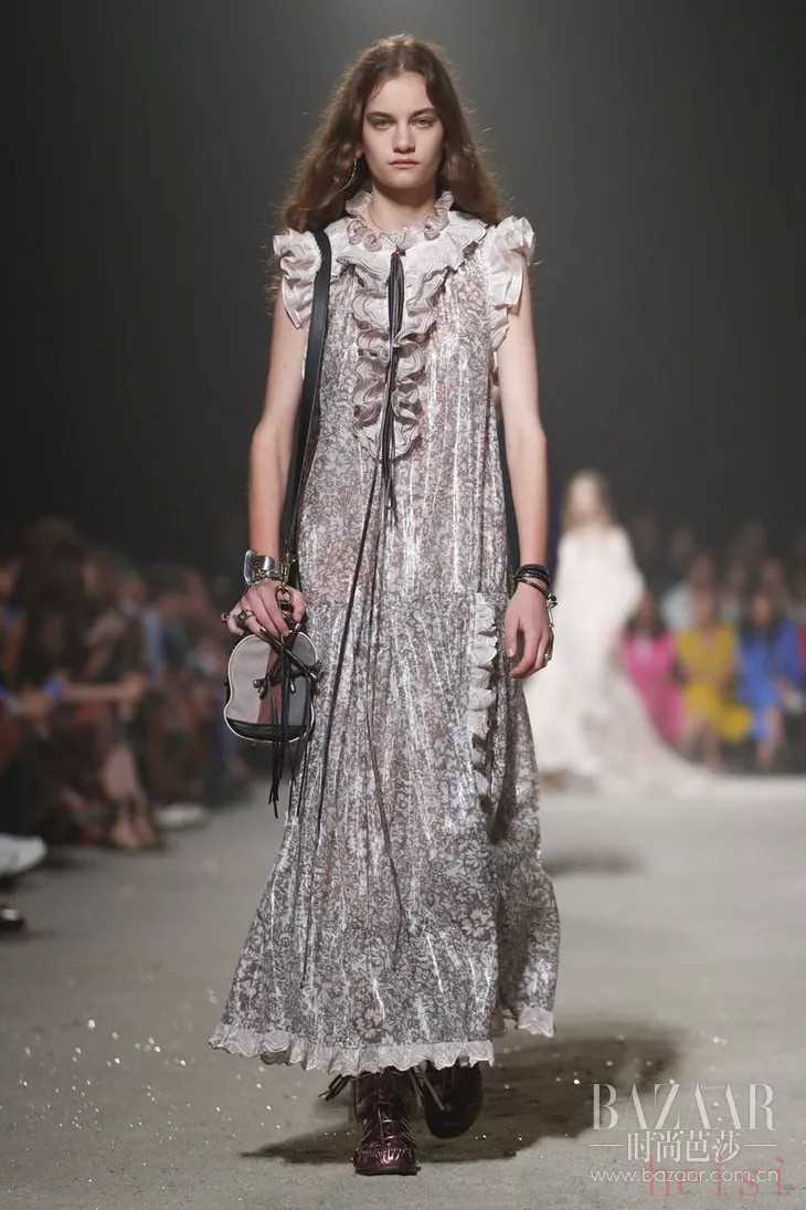 運動風(fēng)的加入也是此場秀的一大看點,休閑運動服被重新演繹,經(jīng)印花裝點了一抹亮色。隨后,扎著一頭臟辮的模特徐徐走出。先前的浪漫風(fēng)情被粗狂的流蘇和麂皮侵占,連少女們也穿上了巴哈式上衣,伴隨著“We’ll go to the horizon”的歌詞,一場嬉皮探索已然蓄勢待發(fā)。