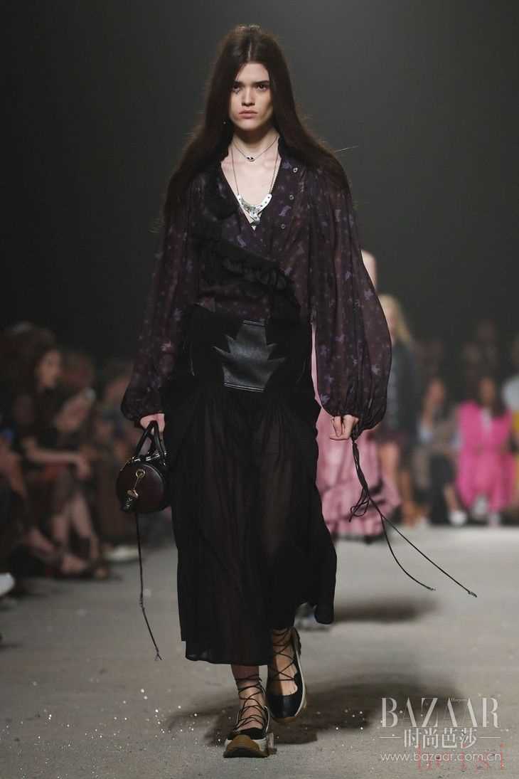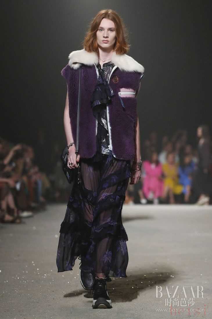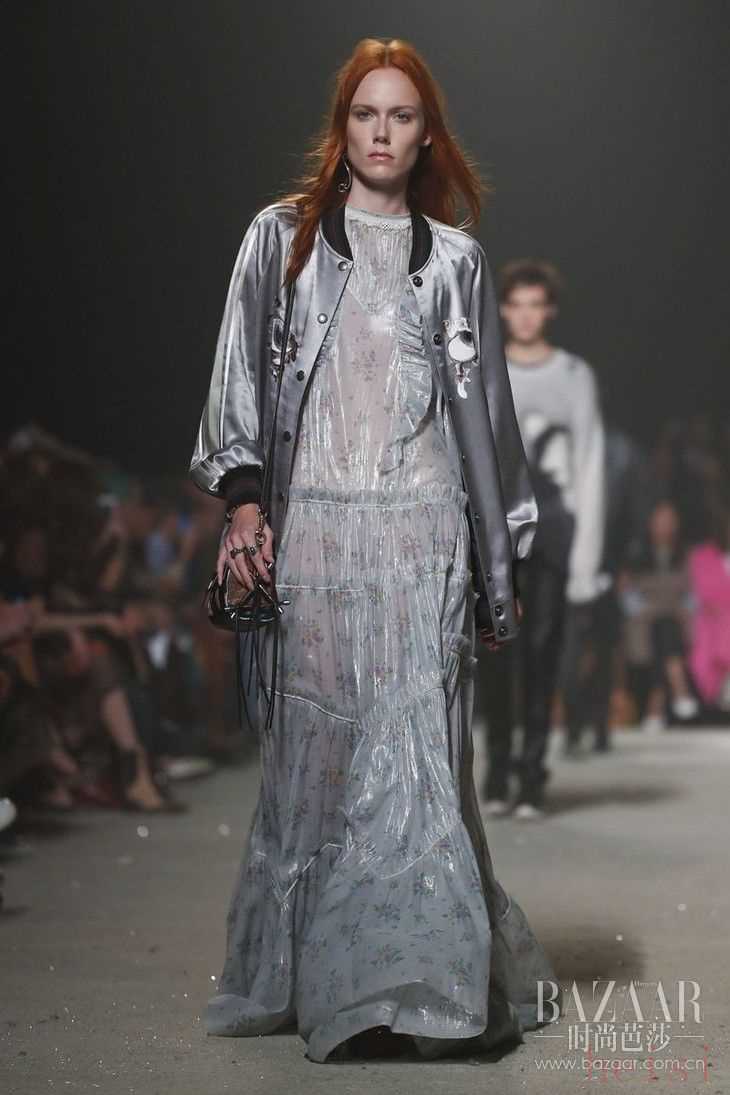 除了以極端的反差形式來貼合秀場場景,當(dāng)然也會有設(shè)計總監(jiān) Stuart Vevers 擅長的暗黑復(fù)古的摩登造型,休閑或是硬朗的夾克套在薄如蟬翼的透視裙之外,別致的西部牧場野性浪漫格外引人矚目,在硬核之下的浪漫紗裙有時是星星閃耀著的安靜夜空,有時又是掀起波浪的不安星空,暗黑風(fēng)中總有一束柔情令人再三側(cè)目。