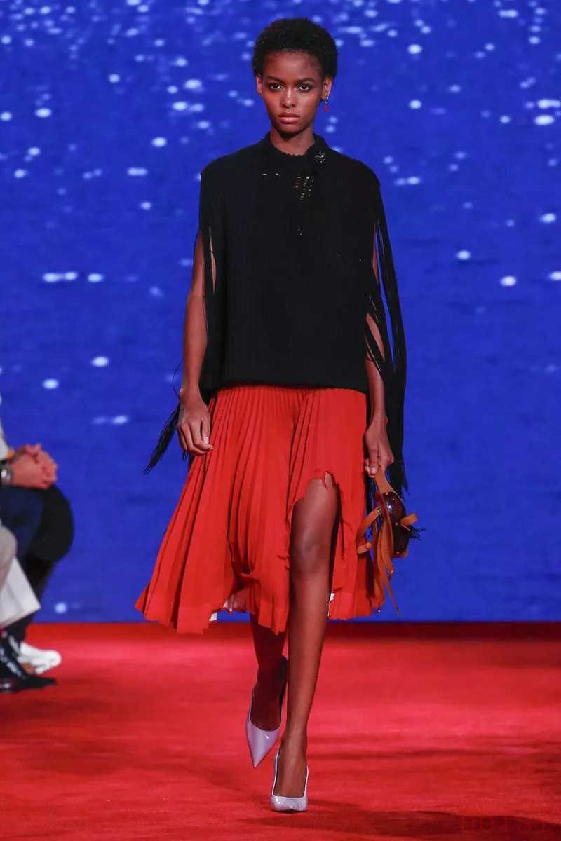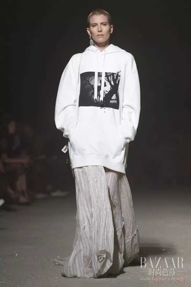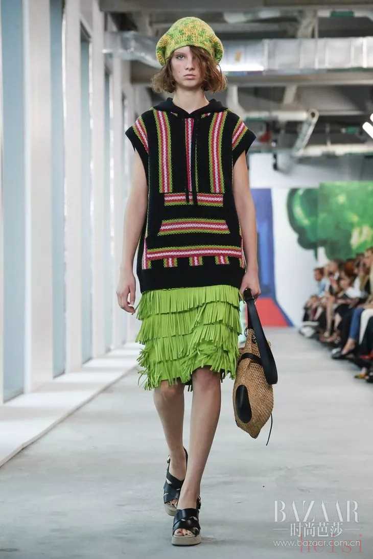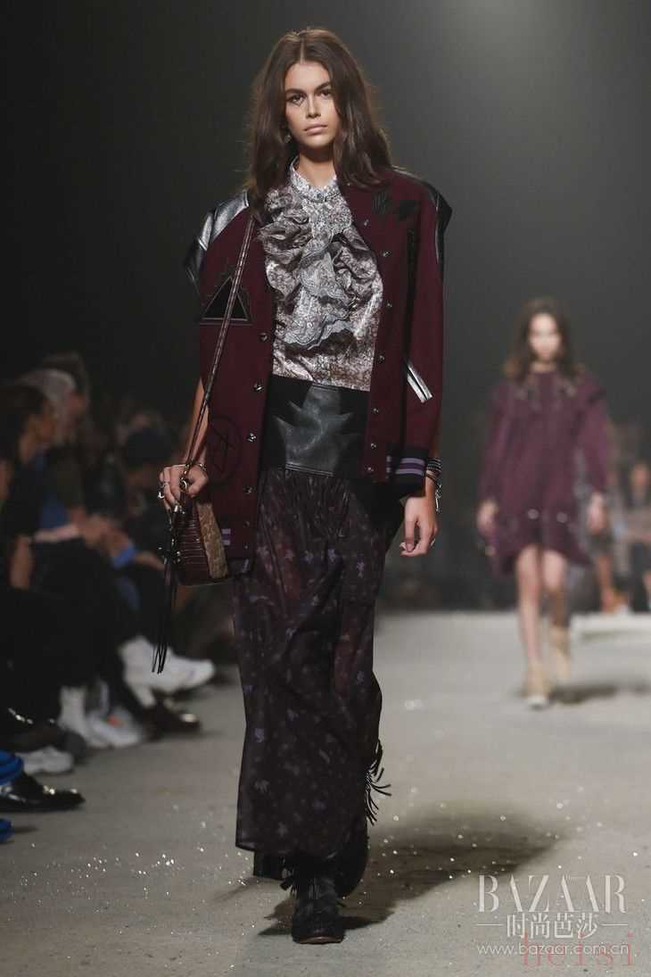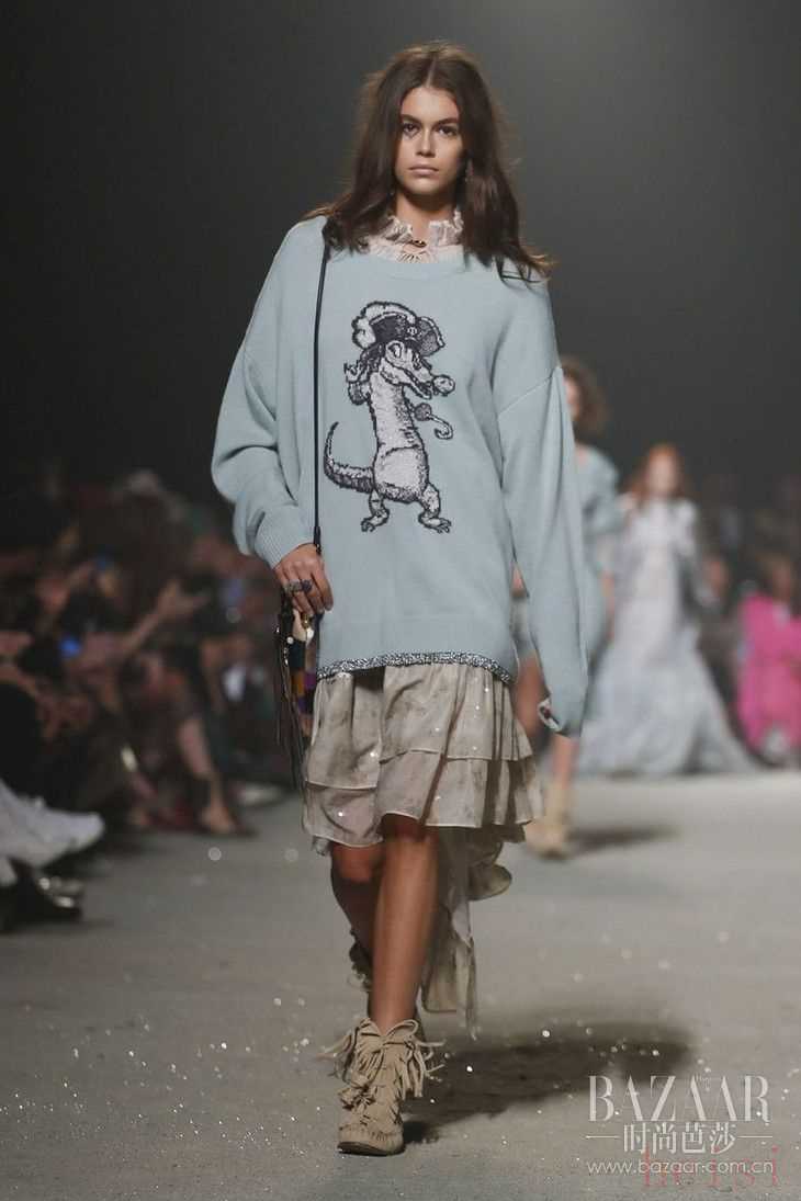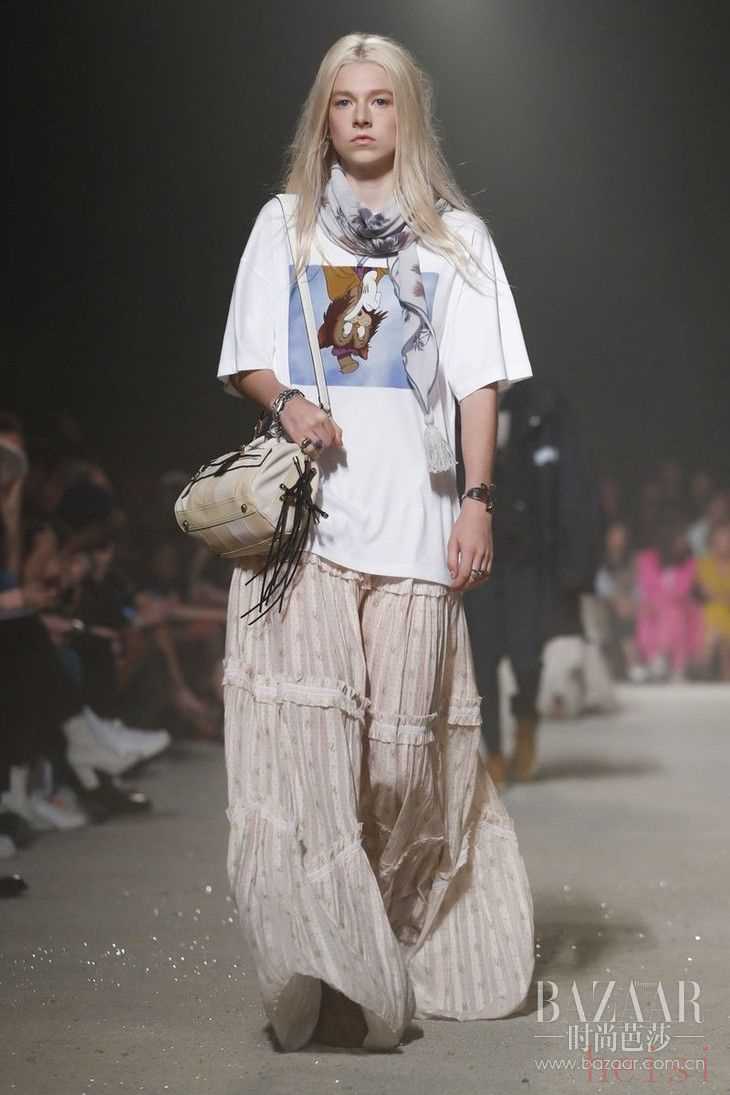 Coach 1941 在本季西部牧場風(fēng)為主導(dǎo)的情況下,也依然不忘紐約街頭的隨性舒適風(fēng)情。作為本場的壓軸造型是迪士尼合作款連帽衫與飄逸的長裙,在此前有T恤、衛(wèi)衣、毛衣與瀟灑的裙裝來打造率性又靈動的紐約街頭風(fēng)。不必注重腰身在哪里,裙子隨著模特的臺步搖曳生姿,仿佛有了生命一樣在律動,這律動仿佛告訴我們這就是自由的時髦。