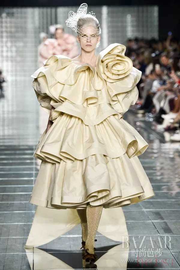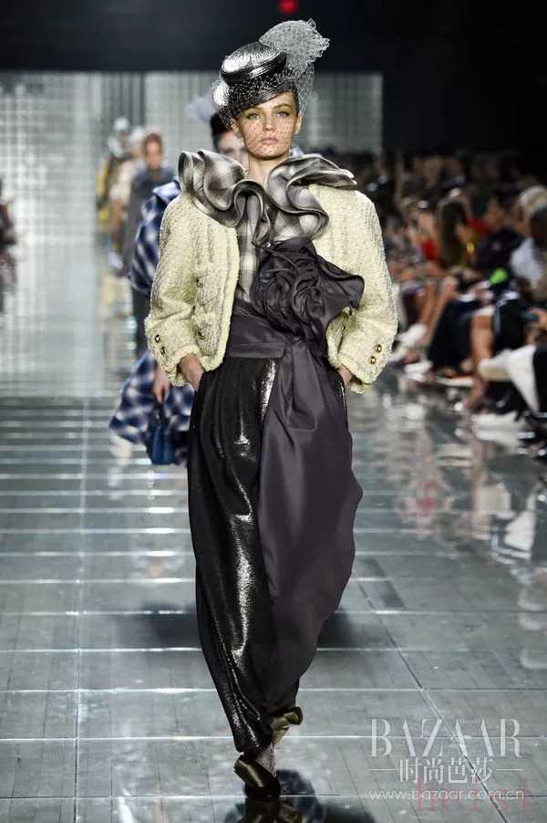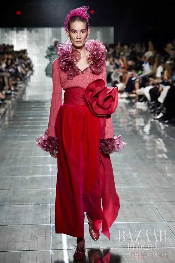 Marc Jacobs還大量地使用了廓形的輪廓和夸張的花朵團簇和層層疊疊的荷葉邊為裙擺、領(lǐng)口、袖口等裝點,一招是剛,一招是柔,即便身體的線條已經(jīng)被衣服巨大的廓形遮住,風(fēng)韻卻是猶存。或許有人會評論這些成衣不實穿,但是要穿Marc Jacobs的女生,又如何只會在意這些衣服實穿不實穿呢?