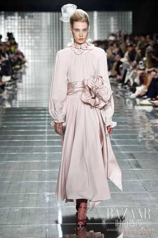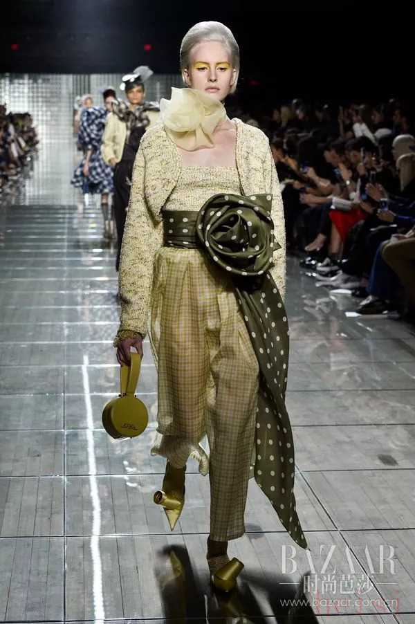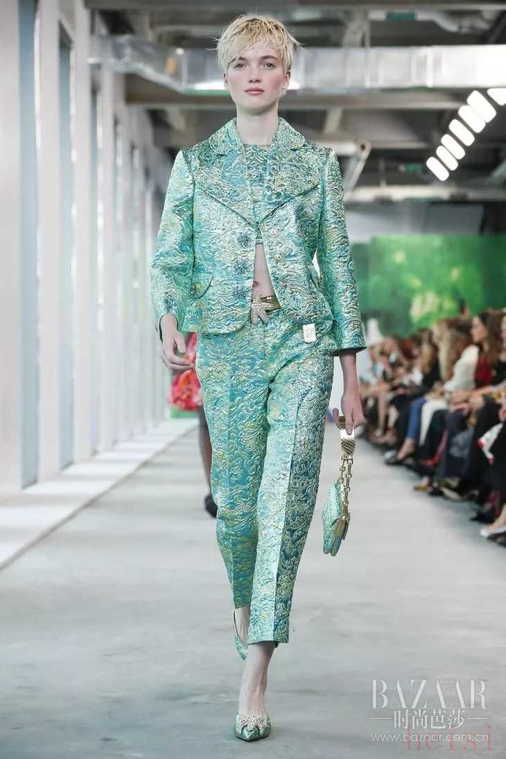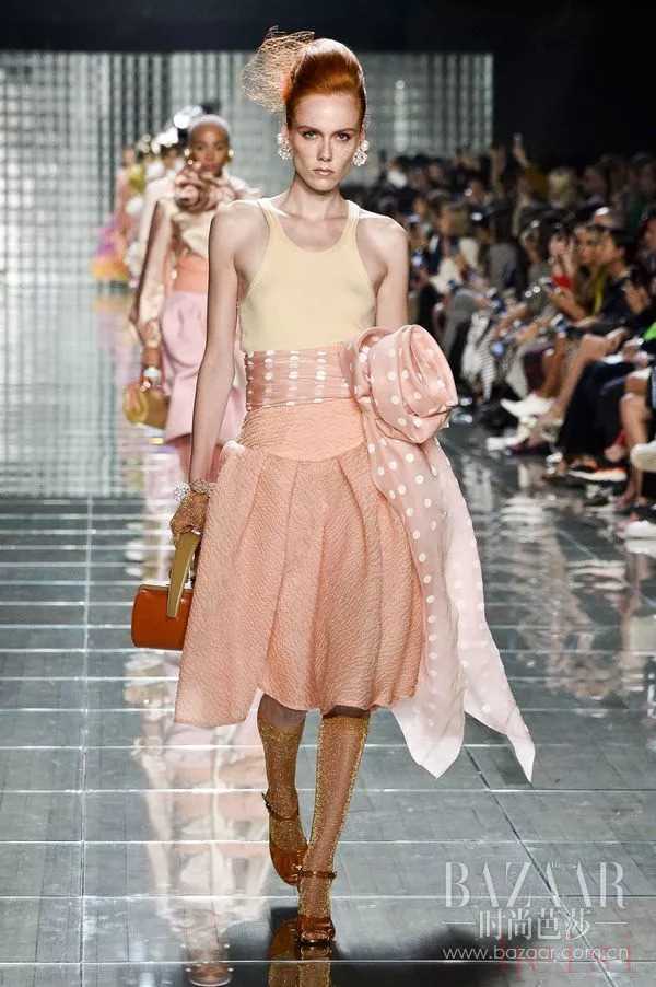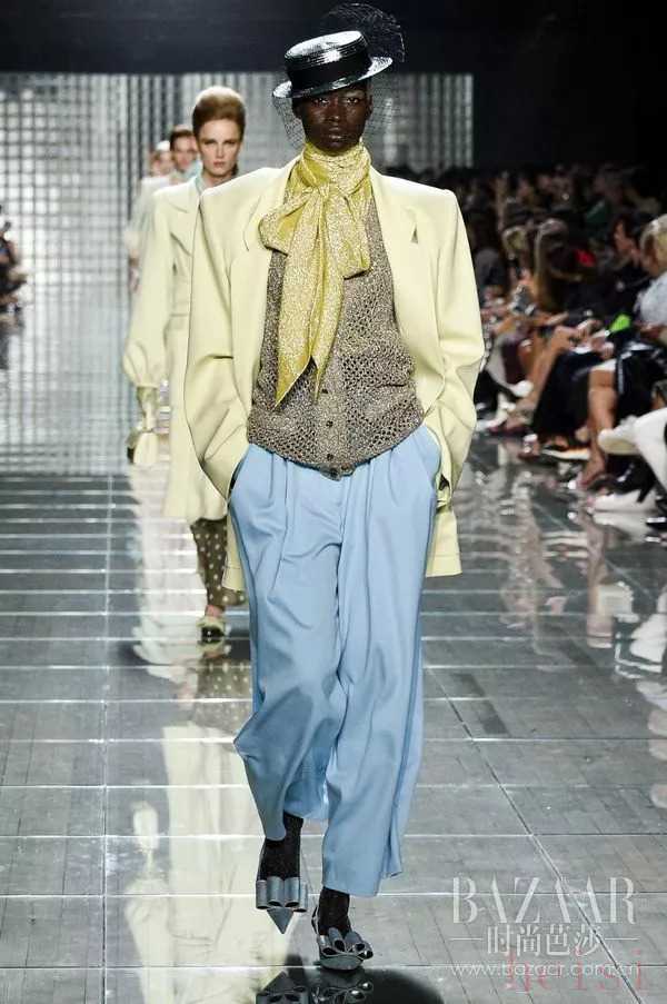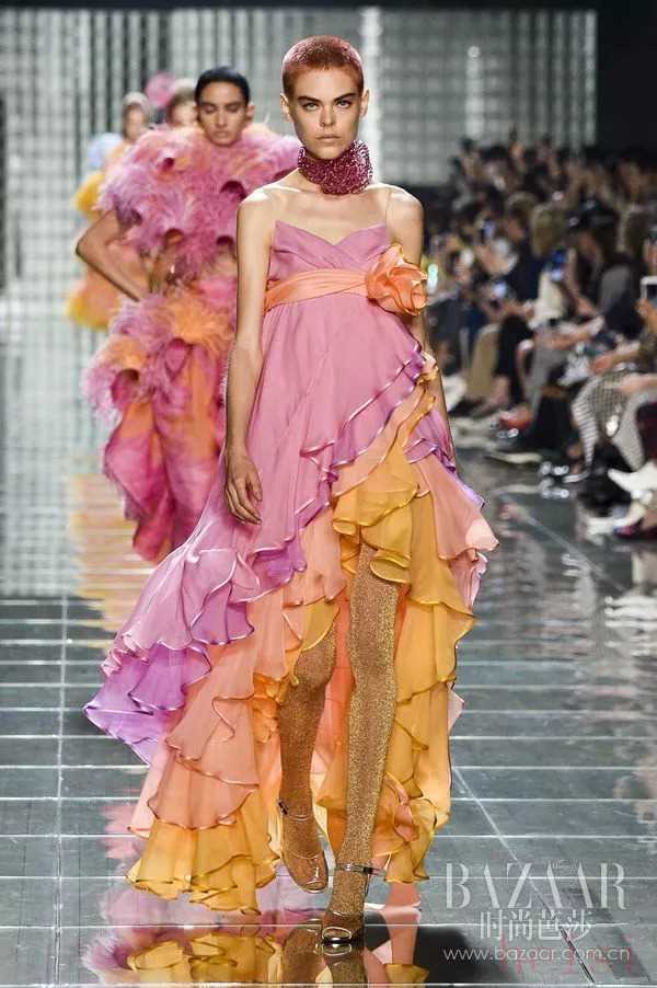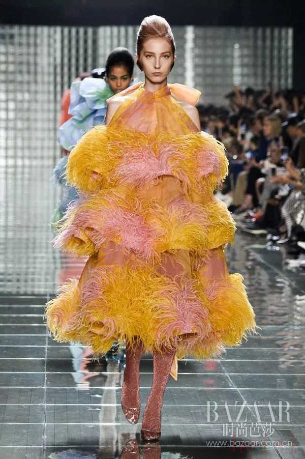 這或者會給人一種分不清是過去還是現(xiàn)實的感覺,可是當(dāng)模特們穿著高飽和度的糖果色成衣魚貫而出,你還是會被一把拉回至21世紀(jì)的當(dāng)下。畢竟色彩變幻貫穿了整個系列,從誘人的黃色、粉色、紅色,到矜持的藕紫色、粉橘色,它們碰撞、對比,呈現(xiàn)出或高或低的戲劇張力,在絲綢、針織、尼龍、皮質(zhì)、輕紗、羽毛、羊毛等不同材質(zhì)間游走,創(chuàng)造出只屬于21世紀(jì)的視覺沖擊力。