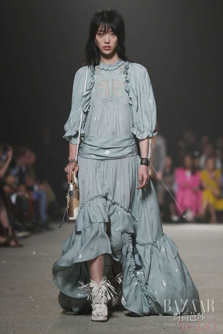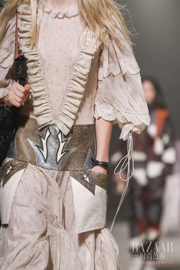 在荒蕪場景之下,Coach 1941 別出心裁地在上衣、裙子上運用了大量繁復(fù)層疊的皺褶與荷葉邊,在皮夾克、包包掛飾與鞋子上裁出精致的流蘇,以公主般貴氣優(yōu)雅的反差將觀眾思緒瞬間帶進這個由矛盾構(gòu)成的奇妙世界中。