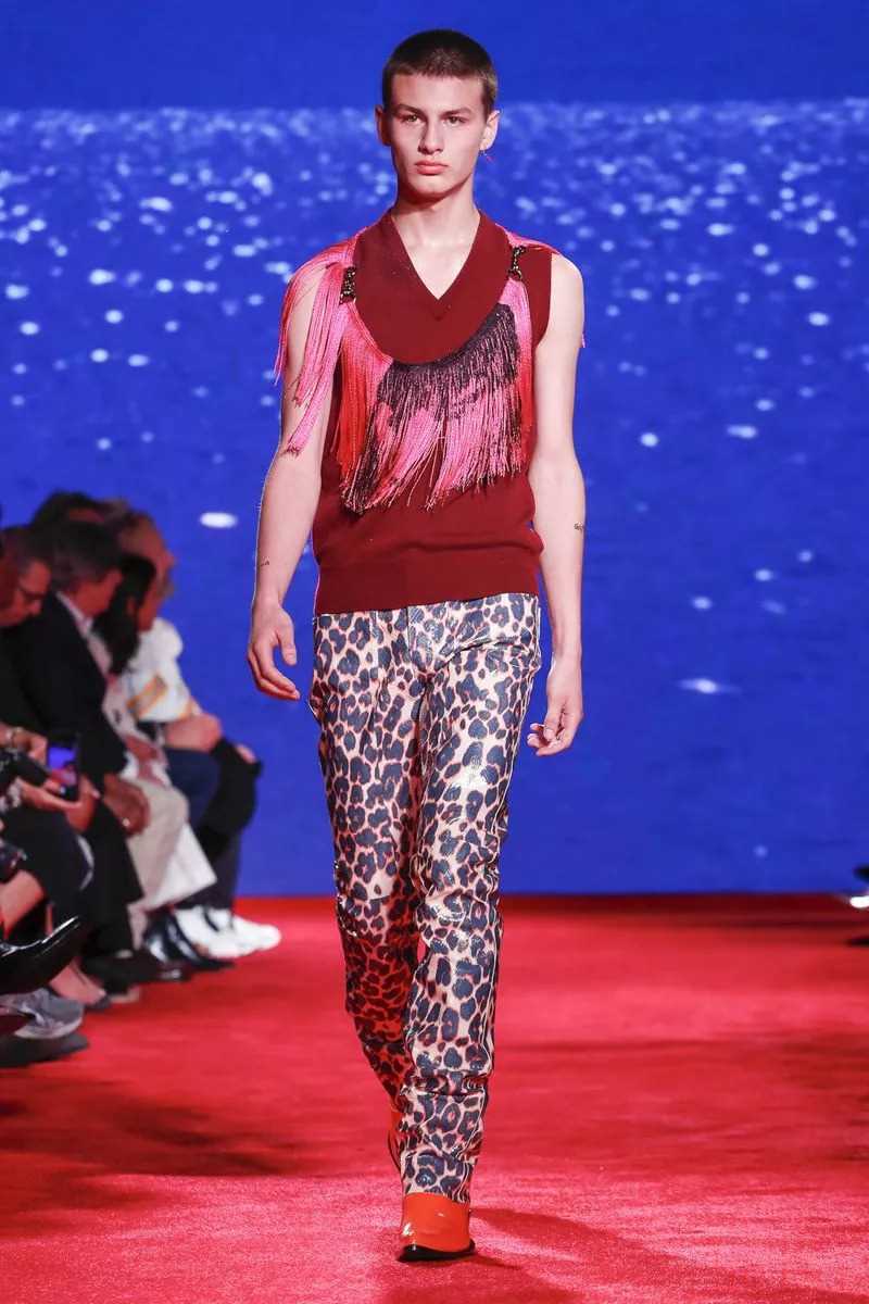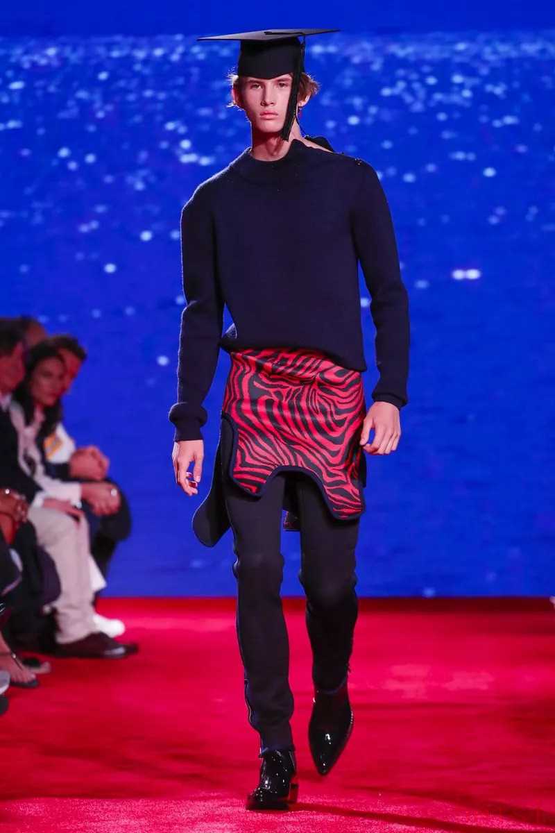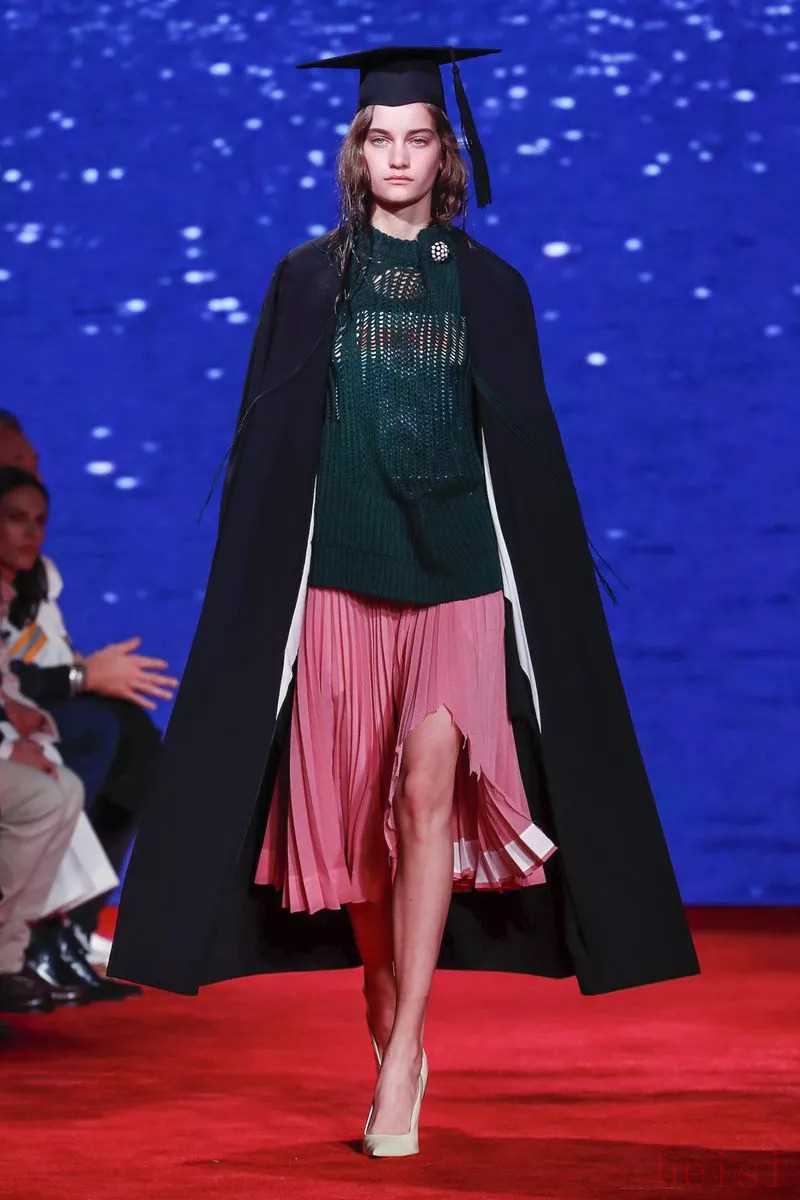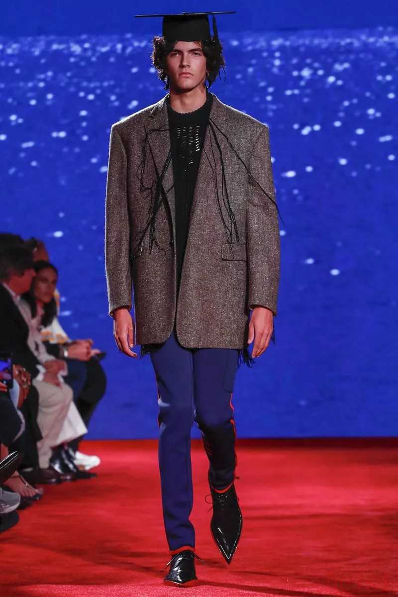 但這種悲觀情緒好像在后半部分被打破,肩線挺括的西裝夾克陸續(xù)出現(xiàn),穿著豹紋褲裝的男孩悉數(shù)登場。緊接著是一頂又一頂?shù)膶W(xué)士帽和以學(xué)士袍為靈感的斗篷……在早春系列中他曾大量運用常春藤盟校的元素,年輕男孩女孩的荷爾蒙,青年時代的狂妄與朝氣,勝利仿佛就在眼前。