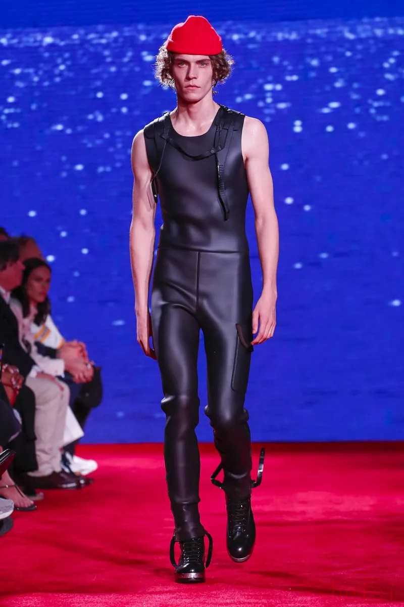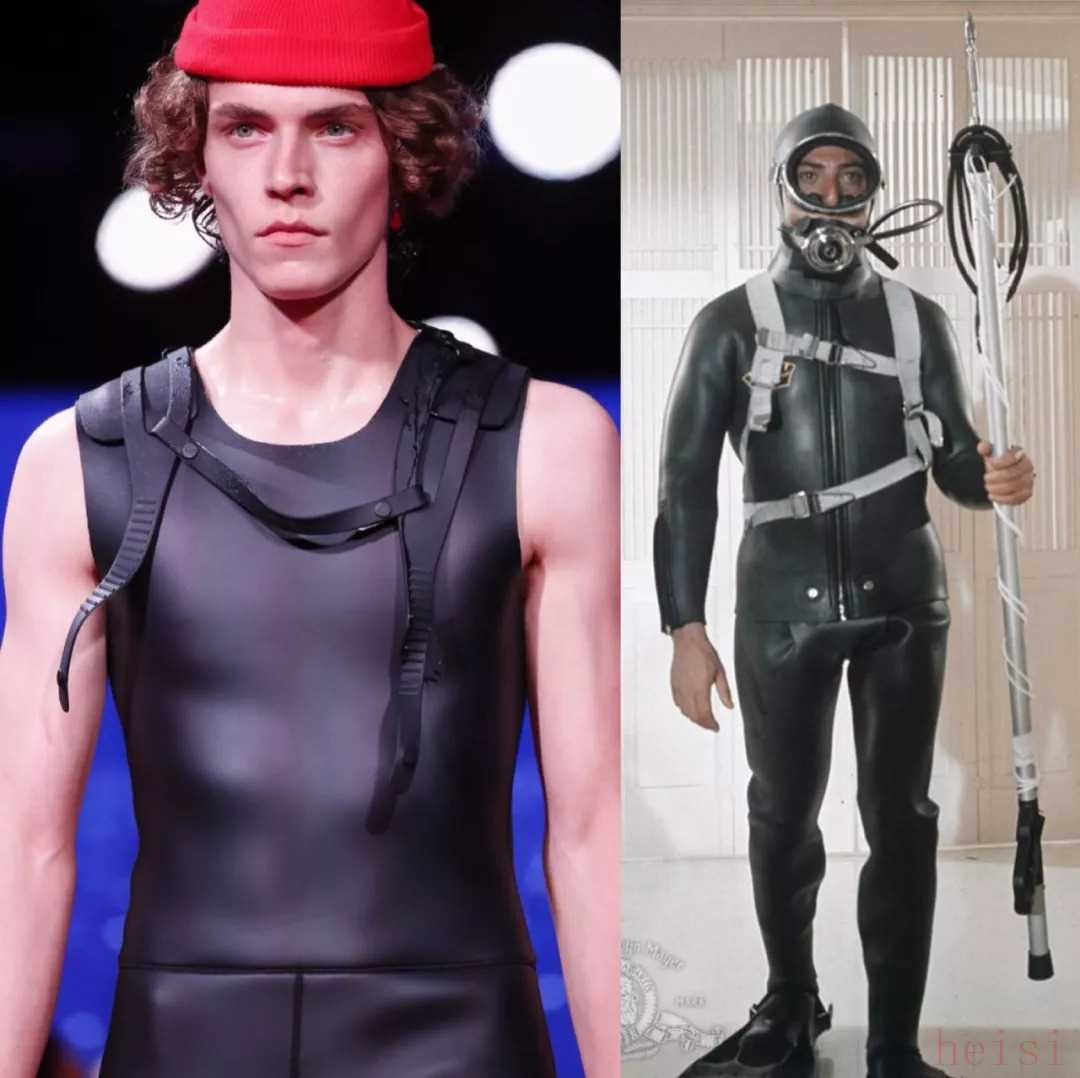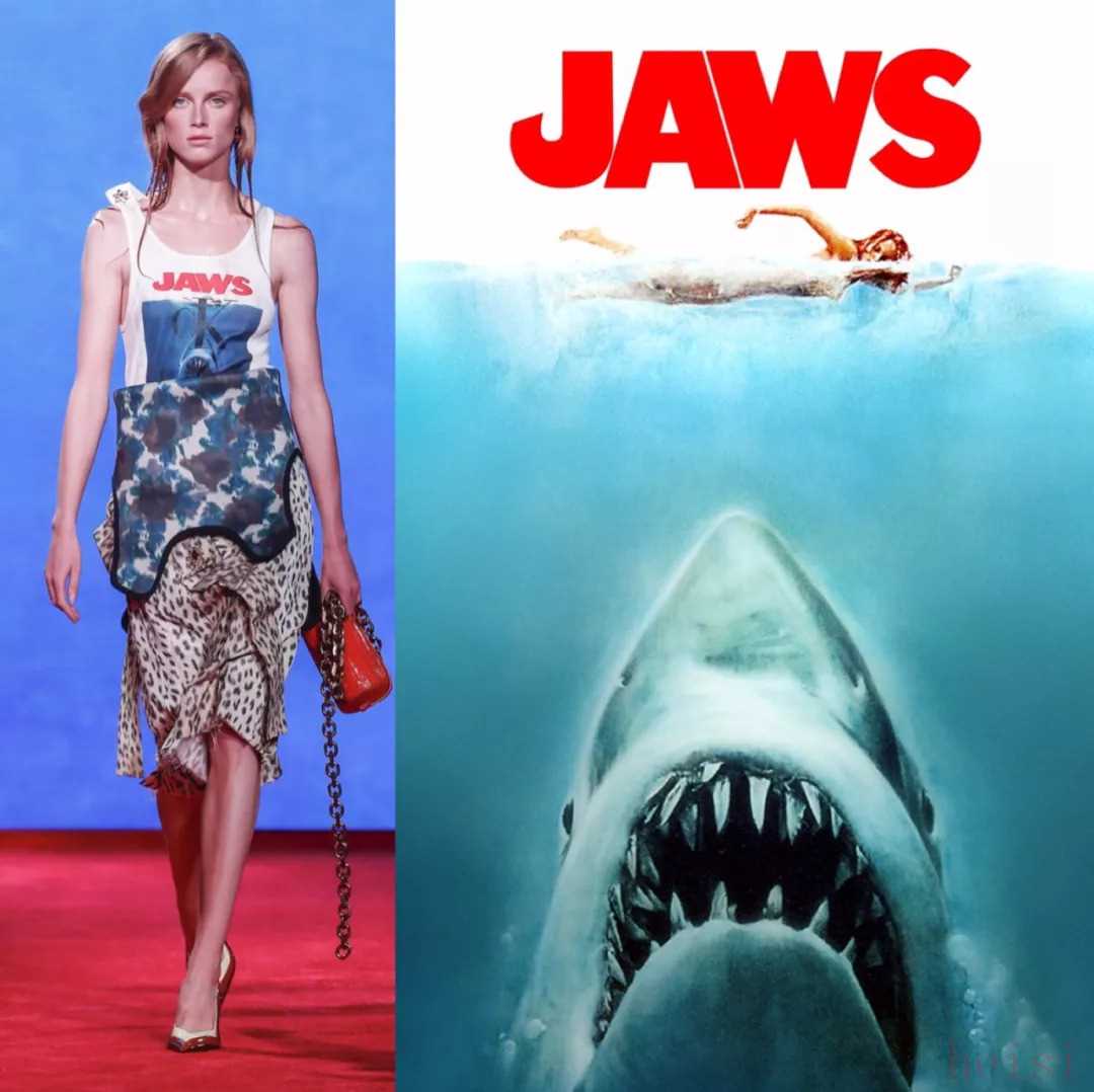 Raf Simons從不掩飾他對電影的熱愛,這一次被他選中則是《大白鯊》和《畢業(yè)生》。最直白的,是他直接將電影海報印在了T恤上,上面還有CK顯著的標(biāo)識,Simons一貫的手法。但略微隱晦的是,他將百褶裙撕裂出一個大口子,看起來就像鯊魚所為,流蘇上也點綴著“鮮血”。靈感來源于《畢業(yè)生》的潛水服在本季擁有兩種穿法,而且還有有著鮮艷的內(nèi)襯。此外還有一些仿似潛水面料的褲裝,看起來和皮褲別無二致。