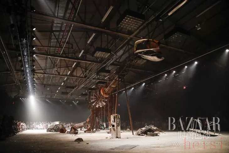 Coach 1941 最新一季的秀場布置令人為之震撼,覆上積塵的廢舊電話亭,汽車零件被撒得七零八落,圍繞著一只廢棄鐵柱支起的巨大恐龍骨架,此刻在童年永無休止的旋轉(zhuǎn)木馬早已生銹,在骨架后端悄無聲息地接受恐龍的主宰。仿佛昭告世界末日來臨的場景靈感來源于設(shè)計總監(jiān) Stuart Vevers 到圣達菲與幽靈牧場旅行,時空交錯產(chǎn)生了未來科技感,置身其中難以抽離。