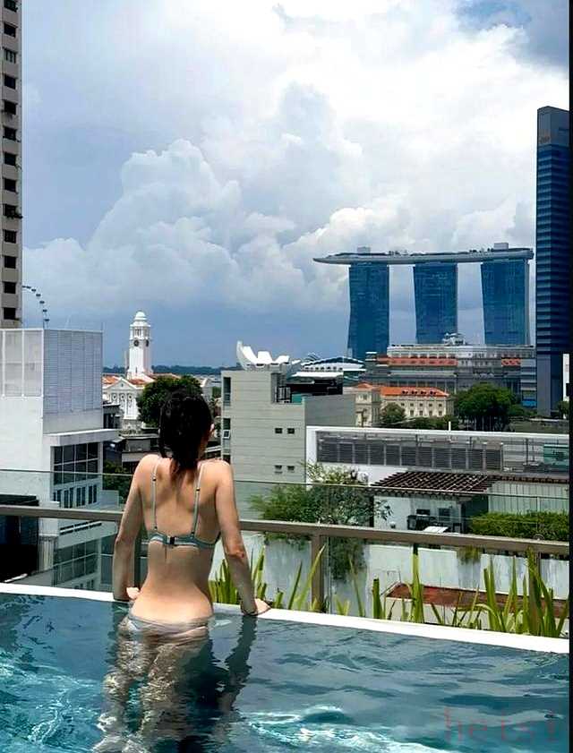 不是那種硬拗姿勢(shì)的雜志風(fēng),她站在金沙57樓無(wú)邊泳池邊,頭發(fā)還滴著水,陽(yáng)光把腰窩那道陰影切得剛剛好。
