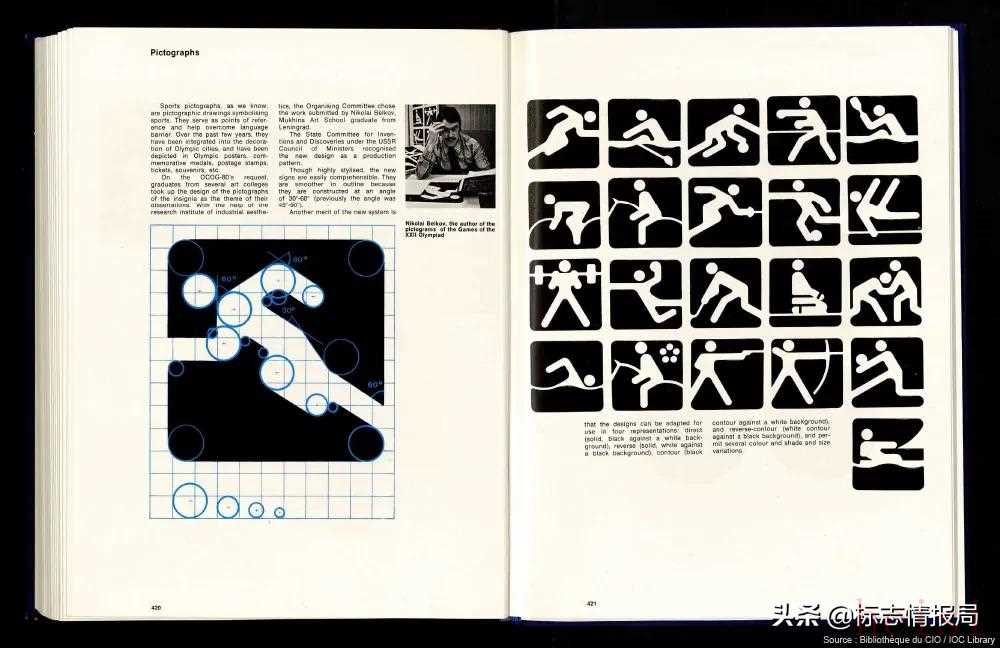 除了徽標(biāo)本身之外,引起我更多注意的是當(dāng)年奧運(yùn)會(huì)項(xiàng)目圖標(biāo)的設(shè)計(jì)。所有體育項(xiàng)目的圖標(biāo)均使用簡(jiǎn)單的圓形和網(wǎng)格系統(tǒng)制作而成,該系統(tǒng)包含4個(gè)不同大小的圓圈和11 x 11網(wǎng)格。在目前找到的電子版本中,我只在一本記錄整個(gè)奧運(yùn)會(huì)的書中發(fā)現(xiàn)了部分指導(dǎo)手冊(cè)的圖像(從第九頁(yè)開始),完整的手冊(cè)貌似沒有公開在網(wǎng)絡(luò)上。