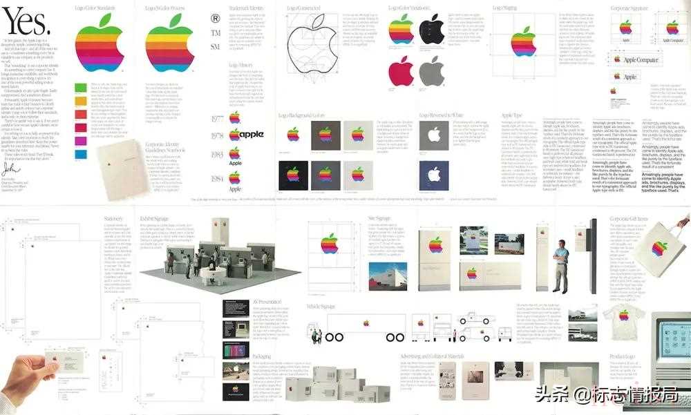 但當(dāng)我在搜索品牌指南文檔時(shí),無(wú)意間發(fā)現(xiàn)了一張印刷于1987年的 Apple 公司企業(yè)識(shí)別標(biāo)志指南的折疊海報(bào)版本,這張海報(bào)最有趣的地方,是我們可以透過(guò)它窺探到這個(gè)時(shí)期的Apple 。