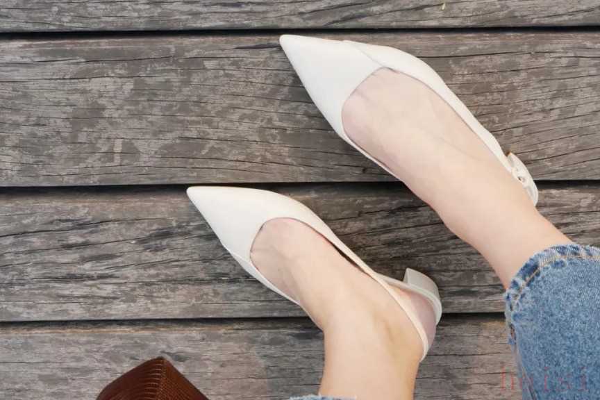 尖頭+低跟拉長(zhǎng)腳背,顯得腳面腳踝都秀秀氣氣的!
