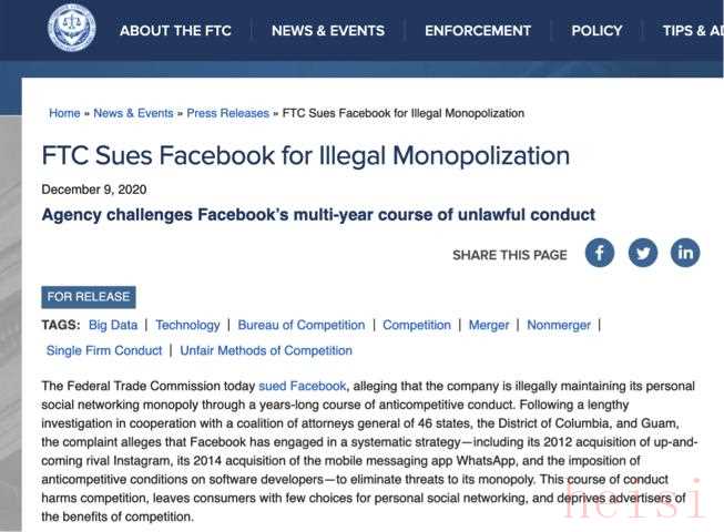 △美國聯(lián)邦貿(mào)易委員會官網(wǎng)發(fā)布關(guān)于起訴臉書的相關(guān)消息