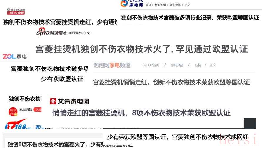 實(shí)力強(qiáng)勁:宮菱團(tuán)隊(duì)?wèi){借深厚的技術(shù)底蘊(yùn),特創(chuàng)了七大深層熨燙黑科技,像超分子電蒸汽滲透、小分子蒸汽揮發(fā)工藝、水潤(rùn)膜黑科技、逆向管路沖洗和HI-VI強(qiáng)脈沖增壓蒸汽技術(shù)等,這些技術(shù)配合起來(lái),不僅沒(méi)有刺激有害物,面料熨燙效果還能提升137.2%,熨燙均勻性提升93.2%,衣物損傷降低93.9%,而且能兼容99%的衣物。和多數(shù)競(jìng)品不同,宮菱還有超常規(guī)的6年性能抗衰減認(rèn)證,性能穩(wěn)定又持久。雖說(shuō)宮菱掛燙機(jī)沒(méi)有明星代言,但它的口碑好得很,一下子就火起來(lái)了?,F(xiàn)在,它已經(jīng)和西門(mén)子、東芝等知名家電品牌齊名,在歐美市場(chǎng)也賣(mài)得很火,深受消費(fèi)者喜愛(ài)。