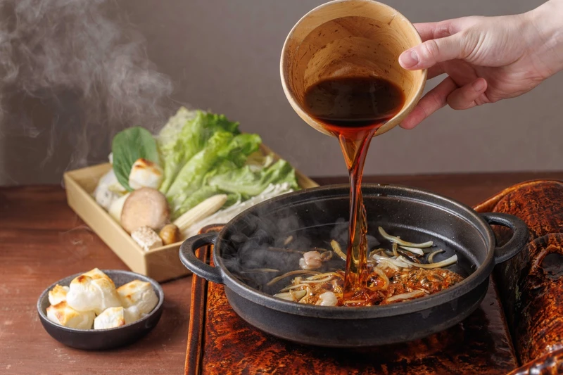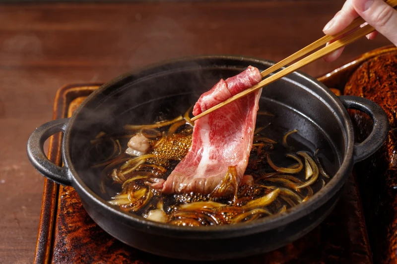 壽喜燒的靈魂在于的醬汁,延續(xù)關(guān)西風(fēng)做法,先以和牛牛油丁炒洋蔥與上白糖,再倒入自製壽喜燒醬汁。湯汁微滾時(shí),油香與糖香交織成誘人的氣味。肉片下鍋不超過(guò)三秒,表面仍帶粉色,口感柔軟卻不失彈性。品牌選用日本A5黑毛和牛,油花分布均勻、肉質(zhì)細(xì)緻,完全能感受到那種的油脂甜香。此外,整體調(diào)味偏清爽,少了重鹹的負(fù)擔(dān),多了溫潤(rùn)層次。另外還有臺(tái)灣在地米種的白飯,可自由取用,并採(cǎi)現(xiàn)煮現(xiàn)盛、可無(wú)限續(xù)加,澆上壽喜燒醬汁后就是最完美的白飯小偷。