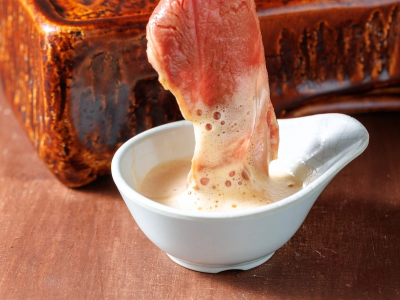 另外還有靈魂醬汁,就是那碗看似無(wú)害輕盈的。以氮?dú)獯虬l(fā)雞蛋與特製醬汁,使傳統(tǒng)黏稠的生蛋液變成如慕斯般輕盈的泡沫。當(dāng)和牛的油脂被柔和地包覆,原本厚重的壽喜燒因此多了一分優(yōu)雅平衡。