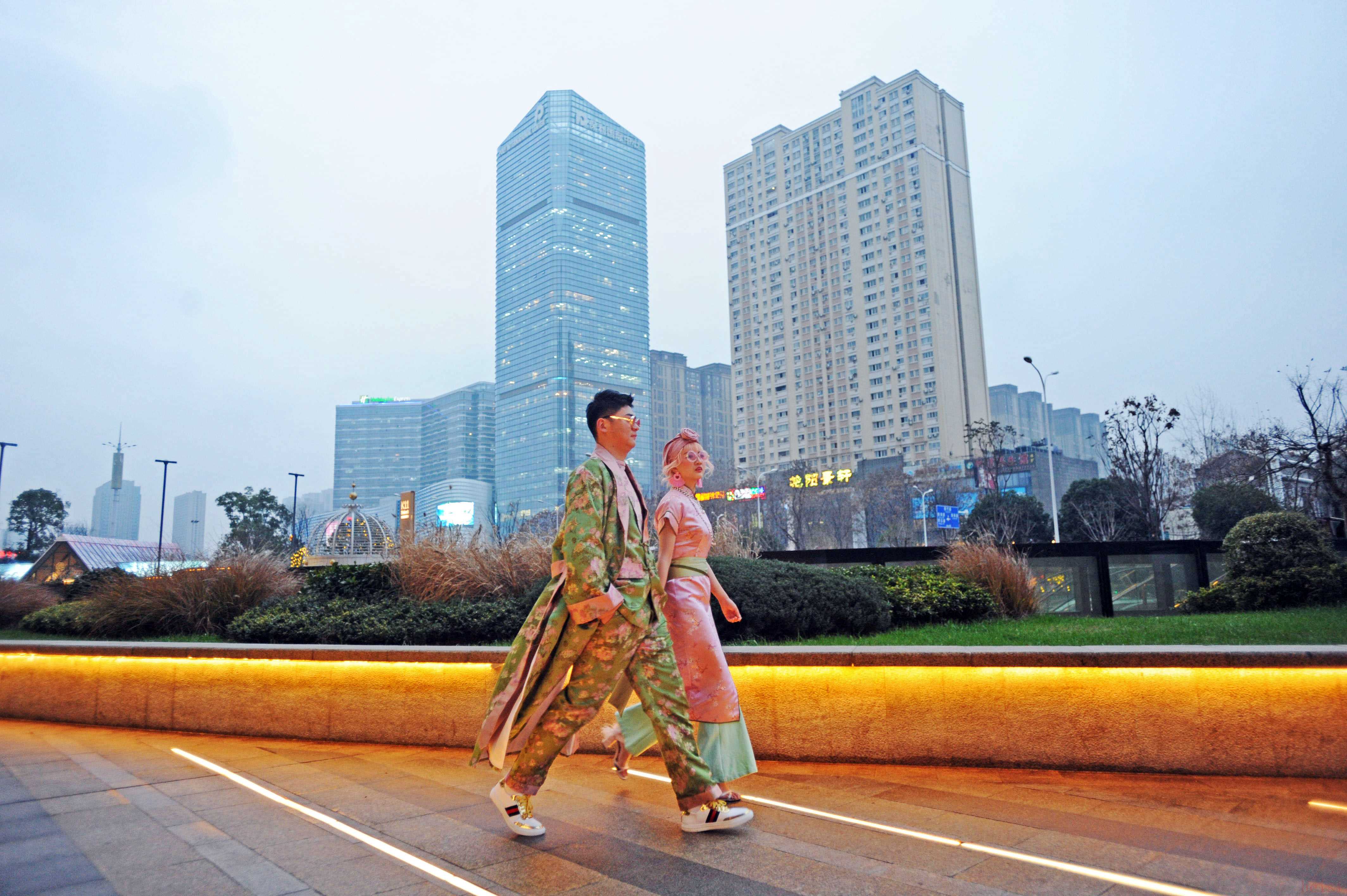 2019年1月10日傍晚,武漢光谷關(guān)山大道街頭,一對新人正在寒風(fēng)中拍攝結(jié)婚照,時(shí)尚的國潮裝扮在城市夜色里格外有范兒。