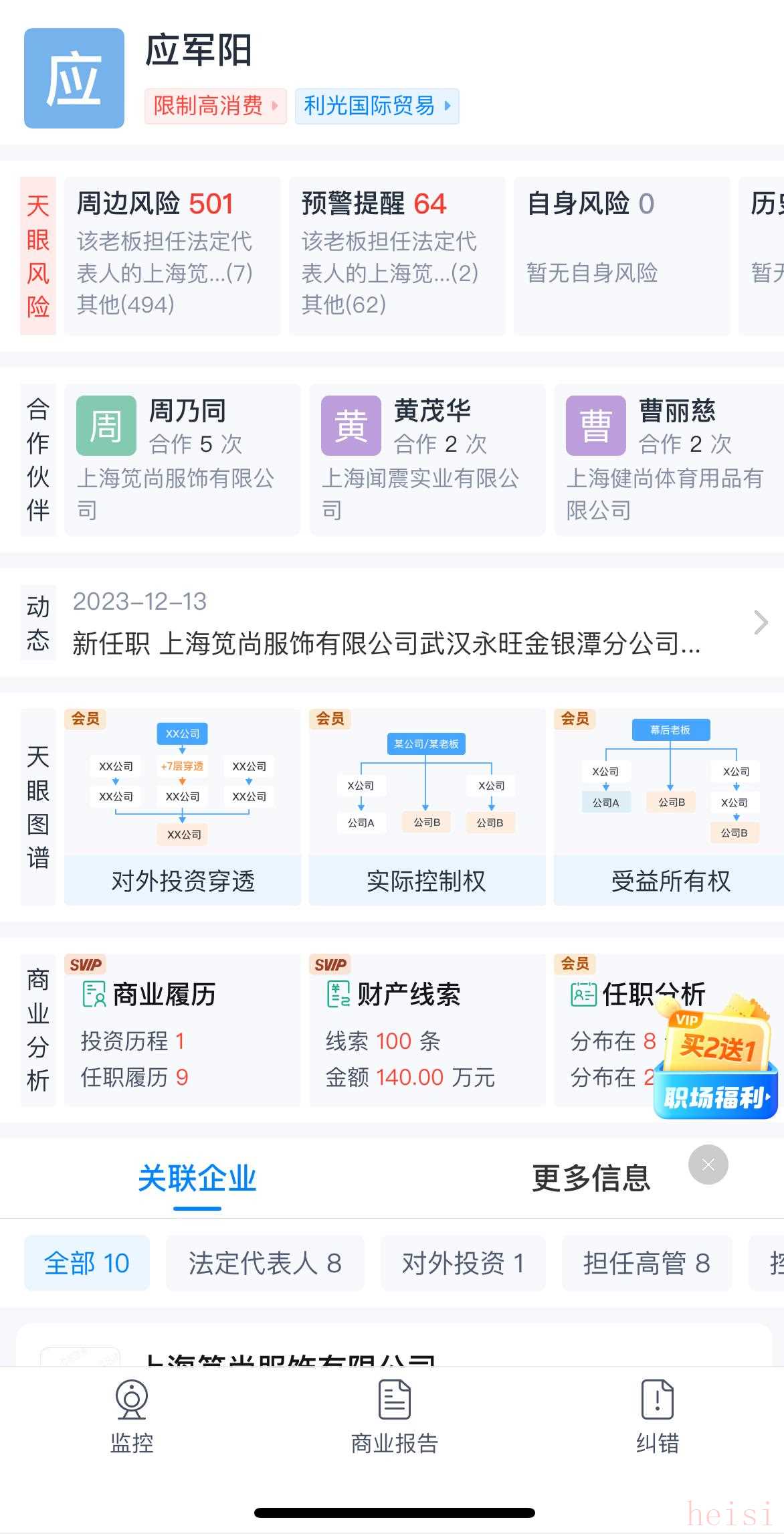 天眼查顯示,上海筧尚服飾存在自身風險481條,周邊風險175條,公司被列為最高人民法院所公示的失信公司,并被列為限制高消費企業(yè)。袁巴元及公司法人應軍陽被限制高消費。
