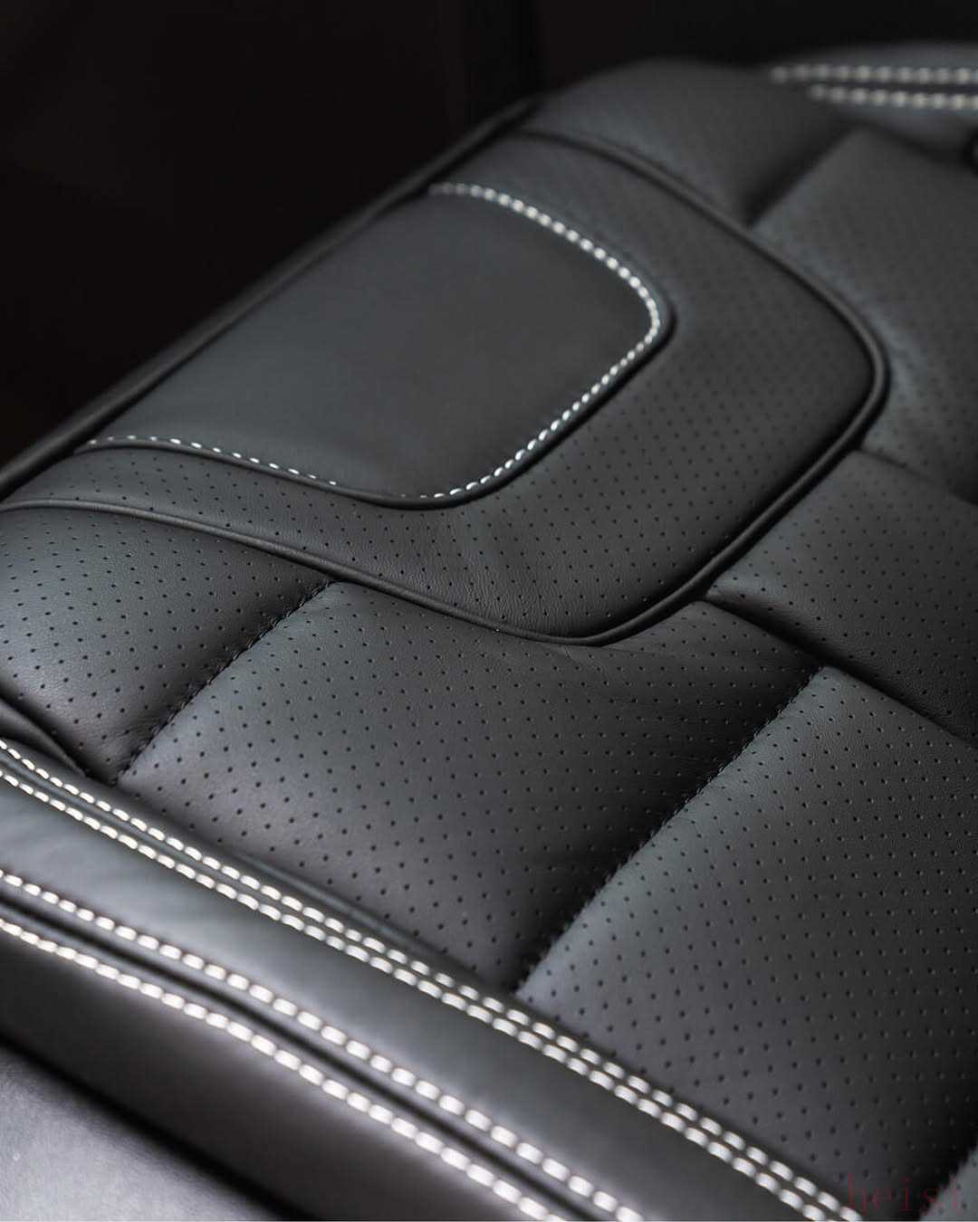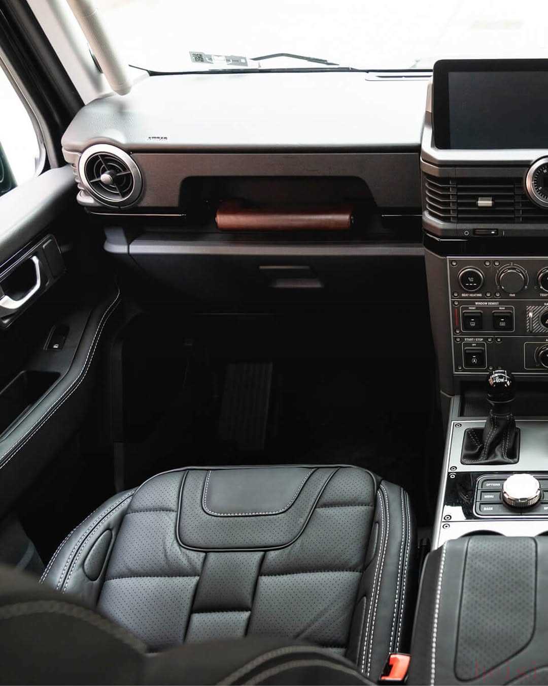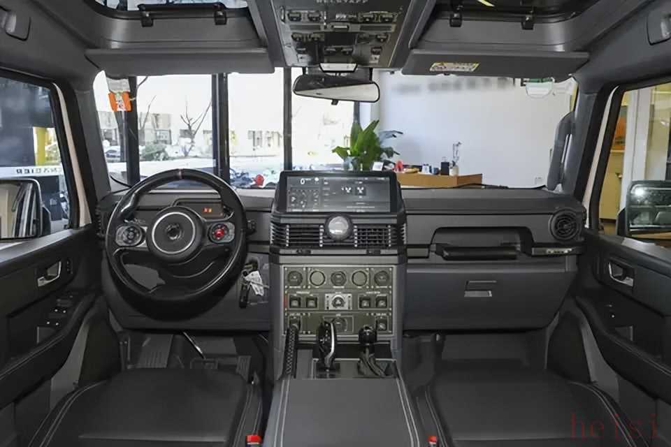 內(nèi)飾以黑色為主調(diào),采用“飛機(jī)駕駛艙式”直線布局,保留機(jī)械手剎與寶馬同款“雞腿”電子擋桿,搭配12.3英寸觸控屏,形成古典機(jī)械感與智能交互的獨(dú)特混搭。座椅采用皮革與耐磨織物拼接,后備廂覆蓋防水材料,強(qiáng)化戶外場景適配性。