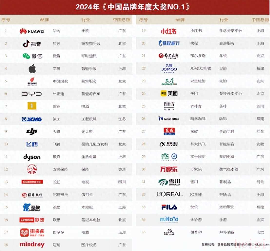 12月18日,由世界品牌實(shí)驗(yàn)室(World Brand Lab)主辦的2024年“世界經(jīng)理人峰會(huì)”在香港正式召開,被譽(yù)為“中國(guó)品牌奧斯卡”的 “中國(guó)品牌年度大獎(jiǎng)”榜單揭曉,蘋果、比亞迪、飛鶴等35個(gè)活躍在2024年度中國(guó)經(jīng)濟(jì)舞臺(tái)的領(lǐng)軍品牌入選“中國(guó)品牌年度大獎(jiǎng)NO.1”。