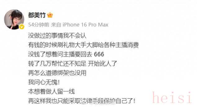 都美竹本人在評論區(qū)回應(yīng)稱:“沒做過的事情我不會認,有錢的時候刷禮物大手大腳給各種主播消費,沒錢了想著問主播要回去,轉(zhuǎn)了幾萬幫忙還不知足,開始訛人了,再怎么道德綁架也沒用。我問心無愧!本想著做人留一線。再這樣我也只能采取法律手段保護自己了!”