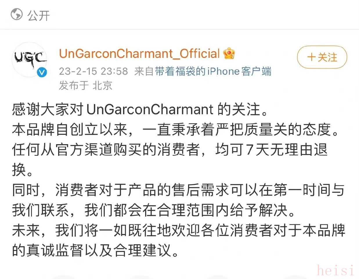 事件發(fā)酵后,UGC品牌作出回應(yīng),表示“任何從官方渠道購買的消費者,均可7天無理由退換”,并歡迎消費者對品牌進行監(jiān)督和建議。該品牌的主體認(rèn)證公司工作人員稱:“不能保證所有商品都是百分之百好評,線頭很多衣服都有?!?/p>